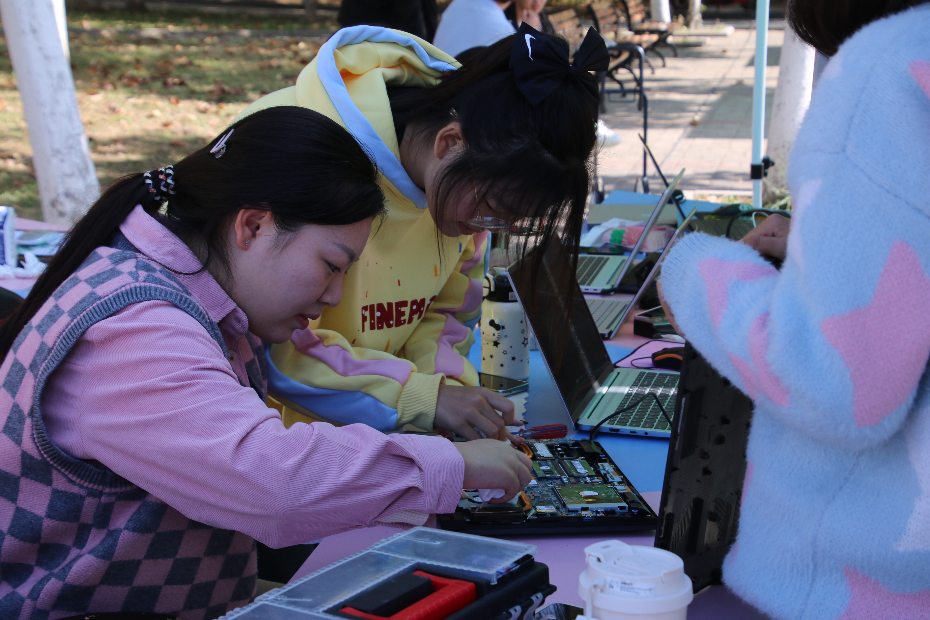 在维修过程中,志愿者们为同学们提供了电脑软件下载,重装系统,充电器,电脑清灰等多个服务项目,也可以维修手机、耳机、鼠标等电子产品。志愿者们凭借着扎实的专业知识和丰富的实践经验,熟练地使用各种维修工具,对故障电子产品进行检测、维修。他们与送修同学耐心交流电器存在问题和解决方式,同时向同学们进行了一些基础维修养护方法讲解。