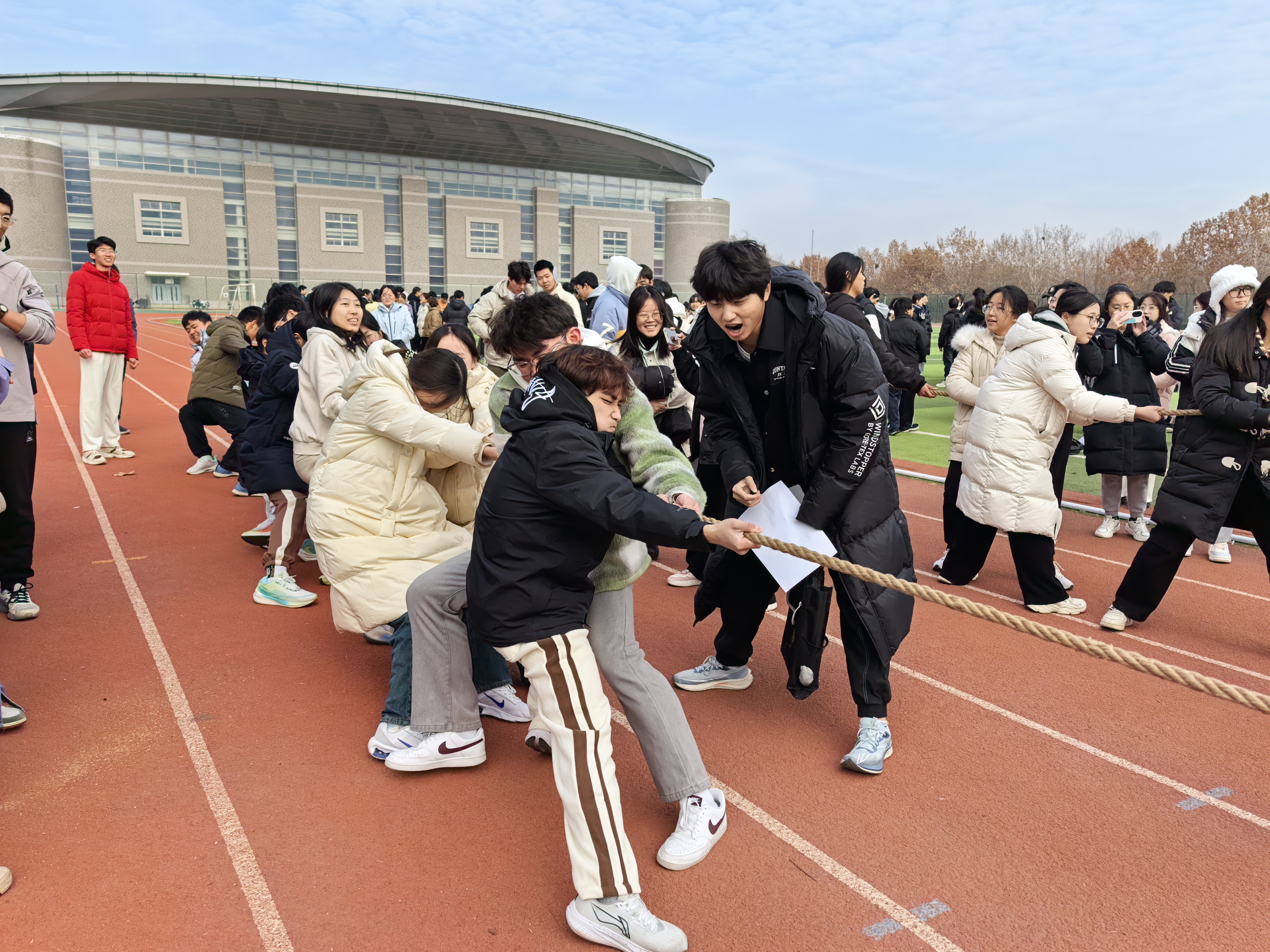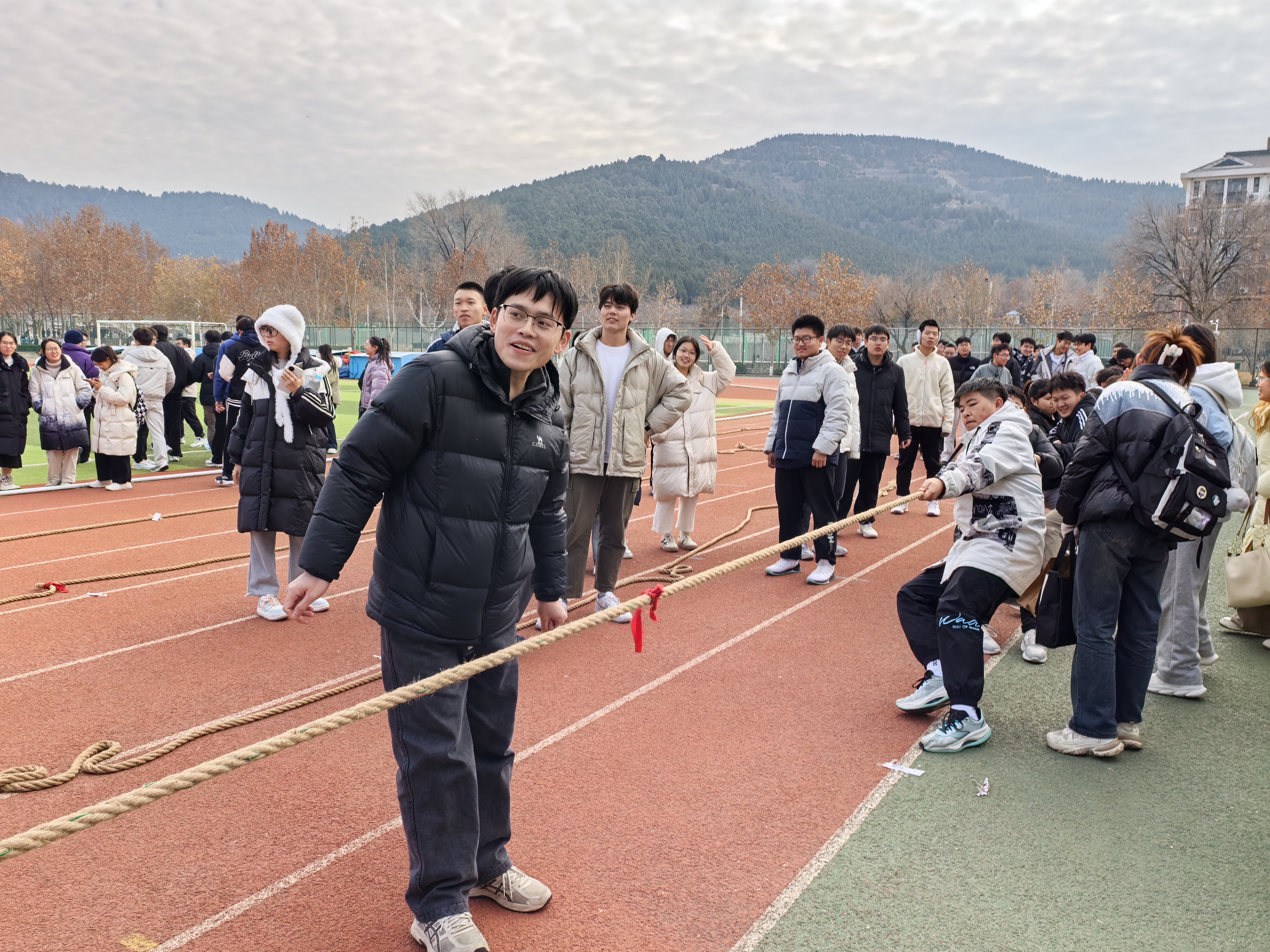 12月9日,物理与电子科学学院在长清湖校区田径场举办纪念“一二·九”运动88周年拔河比赛,2023级、2024级全体学生积极参与。