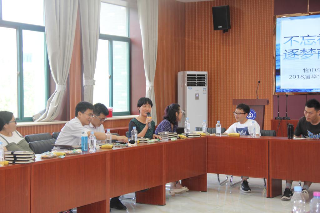 2014级毕业班的学生代表依次讲述了自己四年来的成长历程并表达了对学院和老师们的感激之情,围绕着大学期间的学习、生活和工作各抒己见、畅所欲言。其中,2014级物理2班的李辉通过自己的保研经历对学院提供的机会和平台表示感谢,对学院历年来在外校树立起来的声望感到自豪。之后,与会老师们结合自己大学和工作期间的感悟,告诫同学们要勤奋学习,扎实肯干,做一个有道德、有理想的年轻人,并且要珍惜时间,不负韶华;希望同学们前程似锦,一帆风顺。万金凤对活动做了总结讲话,她勉励同学们要勇于担当,积极进取,不断发扬学院的优良传统,为学院和学校争光,并希望大家能在以后的日子里常回母校看看。活动最后,老师们在纪念本上留下真挚的话语并赠与毕业生,祝福大家日后在各自的领域有所成就。