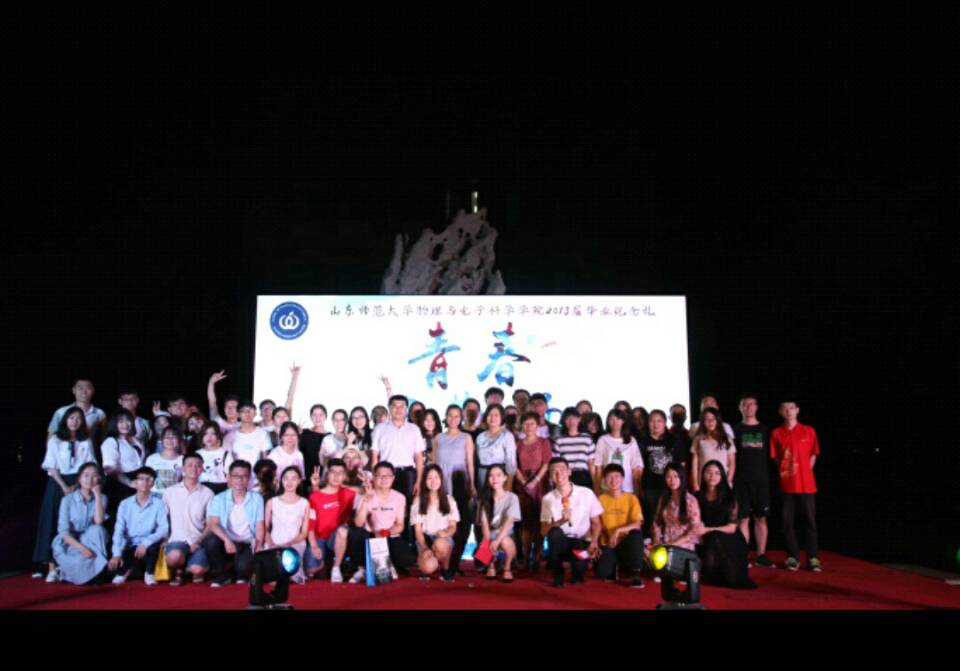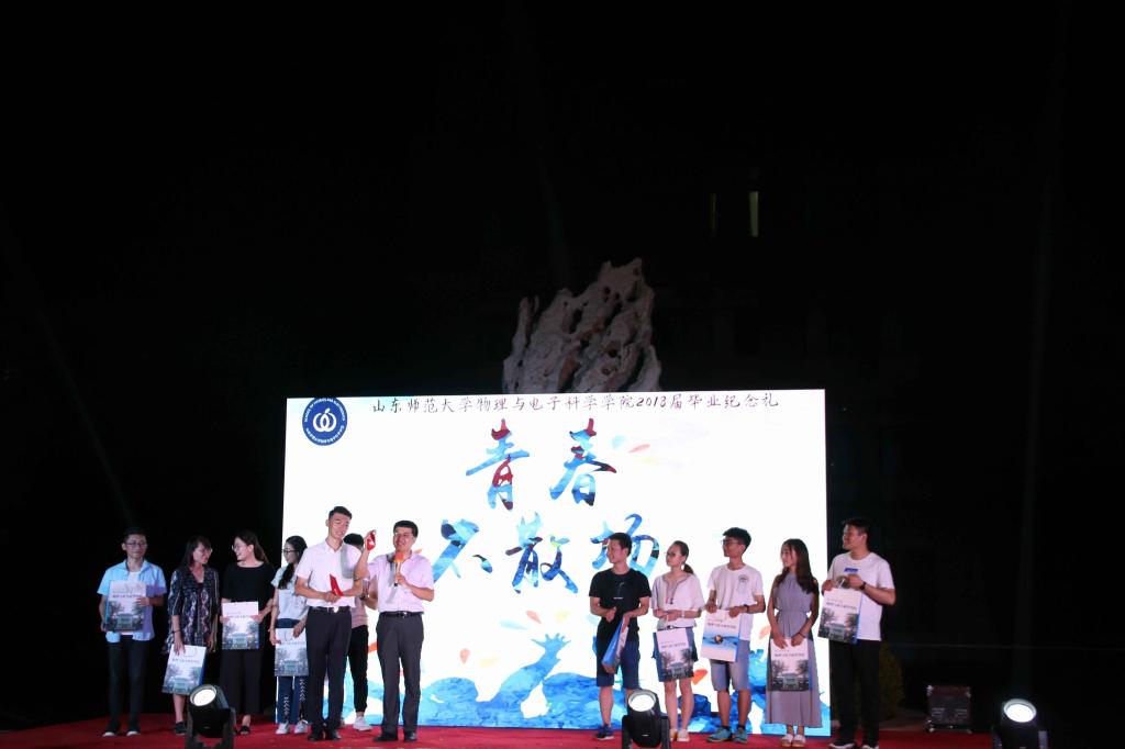 伴随着2014级物理一班乐队的表演,毕业纪念礼拉开了帷幕。典礼伊始,屏幕上播放开场视频,视频由2014级各班同学从入校、军训、参与各种活动、举办联谊到毕业的一些剪影串联而成,带领大家回顾匆匆而过的四年青春。随后典礼进入正式的节目表演阶段,物理二班的舞蹈串烧节目《舞动心扉》风格混搭,男生们活力搞怪,女生们则优雅灵动,展现不同的风采。情景剧《梦回大学》展现了在梦中回到母校的故事,2014级物理四班同学倾注于内的感情令人动容。2014级物理三班的《仲夏浅唱》歌曲串烧附带着一段视频,该班董淑衡在接受采访时说到:“在我的心中班集体永远是最重要的。”除了本科生,研究生也带来精彩表演。曾经是院十大歌手的研究生郭聚鑫深情演唱一曲《男孩》,说起这段在山师学习的经历,他感慨万分,表示这将是他最难忘的回忆。表演结束后,杜伟等老师向毕业生赠送学院准备的纪念礼品,是一套精美的私人订制印章组合,印章上面刻有山东师范大学大学的校徽、名称及每位同学的名字。接着王东磊发言,她用饱含爱与关怀的话语对2018届毕业生表达自己的祝福与希冀,最后她动情的说:“我永远都是同学们最坚强的后盾。”之后毕业生们进行合唱、合影等活动,本次毕业纪念礼圆满完成,2018届毕业生的大学生活也就此画上句号。
