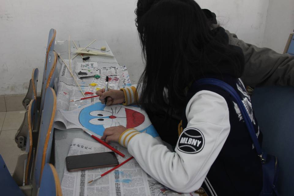 上午,报名参加比赛的同学于文渊楼C区249、255教室分组合作完成风筝的制作。首先,活动负责人宣读比赛流程。风筝制作如火如荼地进行,同学们研究风筝构造,组装风筝,简单的木条、白布在同学们的巧手下化为一只只坚固的风筝。随后,白色的风筝经过同学们的创意涂鸦,变成一幅幅生动的图画,有栩栩如生的蝴蝶、活泼生动的蜜蜂、朴素淡雅的桃花……同学们发挥想象,尽情创作。紧接着,实践部在微信公众号“山师物电团委”发起“风筝制作大赛选美投票”,经过大众评选,选出了10只最美风筝。