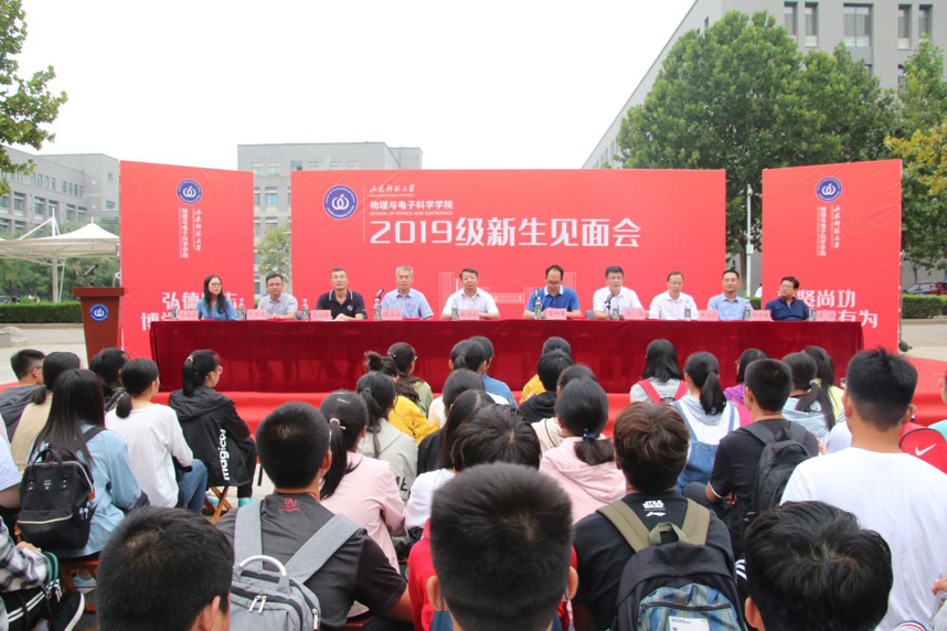 2019年9月17日下午,物理与电子科学学院于长清湖校区文澜楼A区广场举办新生见面会。物理与电子科学学院党委书记谢德仁,院长蔡阳健,教师代表国承山,副院长赵曰峰,副院长宋玉志,工会主席修显武,物理系主任胡贵超,电子系主任王晶晶,团委书记周勇及学院新生辅导员方芳、于双阳、吴钰玮出席会议。2019级473名本科新生、74名3+2贯通培养新生以及151名研究生新生参加见面会。会议由学院党委副书记杜伟主持。