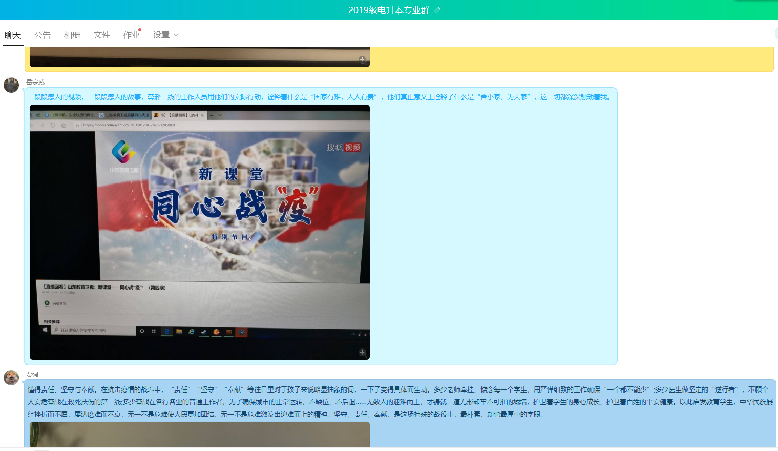 2.上传图文,保证节目收看质量。为保证学生认真收看,提高节目观看质量,学院有序组织,领导和教研室主任带头观看,每天按时提醒学院教职工收看节目。各年级辅导员也在年级群内反复提醒,确保每位同学能够准时收看特别节目。各年级要求3月14日至3月20日,在各自的班级群里,同学们或将自己观看视频的照片发到群中,或在群内抒发自己的看法与感受,强化巩固节目观看效果,切实起到培训作用。各位教职工老师也纷纷写下自己的感受,同时在群内进行交流讨论。姜守振老师说,虽然自己不能像志愿者一样去支援武汉,但是可以从点滴小事做起,谨记疫情注意事项,保护好自己和家人。18级李嘉禾表示,通过讲座和答题学习了许多关于新冠病毒的知识,也了解了怎么更好的进行疫情防护,非常实用,多学一份知识,健康就多一份保障。防疫工作需要齐心协力,加油中国,我们一定可以共渡难关。
