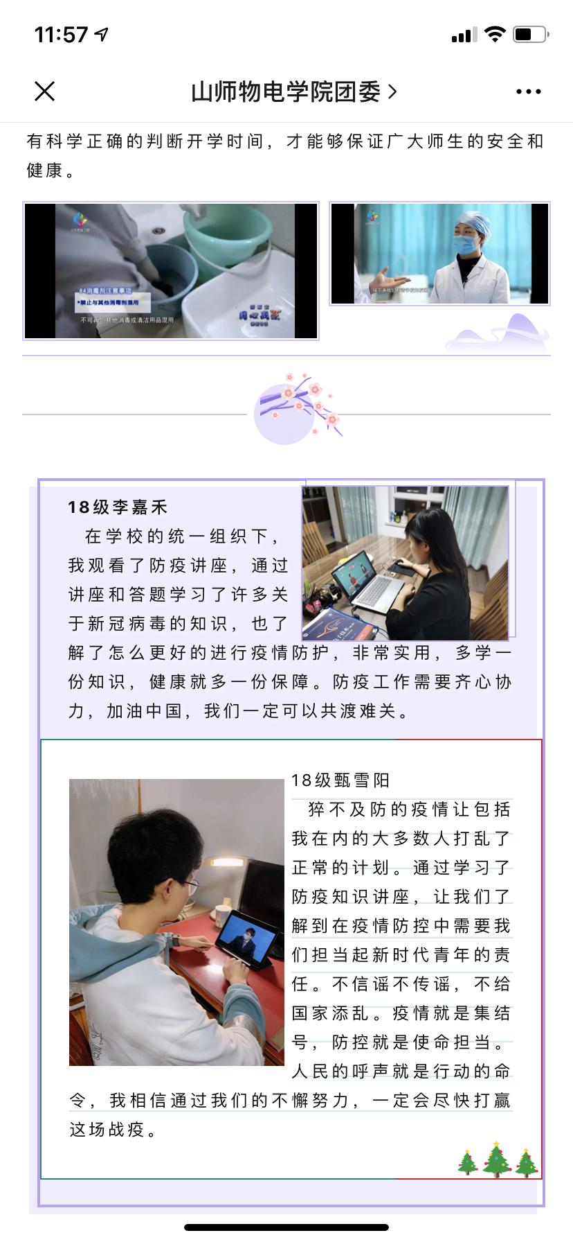 3.坚定必胜信心。16级卓物班高旭同学提到,现在疫情防控到了关键的时候,身为新青年的我们要时刻保持清醒的头脑,坚定信心,并以身作则,不听、不信、不传任何未经国家政府认可的言论,相信我们一定能够打赢疫情防控阻击战,用自己的行动和呐喊为武汉加油,为湖北加油,为中国加油。胡贵超老师说到,自己要以身作则,做好个人卫生防护工作的同时,也要密切留意学生状况,维护校园健康。考虑到疫情期间教学情境的变化,利用多种途径,做好授课和学生指导工作,多和学生沟通,维护学校教学科研工作的正常秩序。