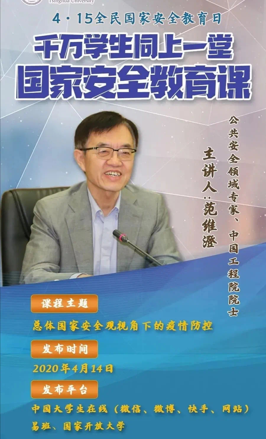 2020年4月14日上午10:00,教育部推出《千万学生同上一堂安全教育课》活动,本次活动以总体国家安全观视角下的疫情防控为主题,由公共安全领域专家、中国工程院院士范维澄教授主讲。物理与电子科学学院组织全体本科生和研究生认真观看,明确我国总体国家安全体系和疫情形势下对大学生建设和维护国家安全体系的要求。