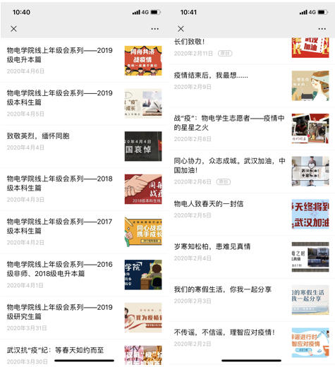 活动倡导,丰富学生生活。学院向学生发出“停课不停学”倡议,鼓励学生做疫情防控的示范者,居家期间的好学者。积极发挥党团组织作用,在线指导学生开展活动。“战疫在行动”主题党日活动,通过主题党课、战疫宣誓、担当防疫志愿者、制作武汉加油视频等方式,引领党员以实际行动为疫情防控工作做出贡献,彰显大学生党员的精神面貌和责任担当。在“抗击疫情,青春有我”系列主题团日活动中,每项活动由一位辅导员专门负责,对活动进行督促指导,从学习、健康、科研、竞赛、心理等角度全方位拓展假期生活。组织全体学生收看疫情防控规范培训,全国大学生同上一堂疫情防控思政大课、千万学生同上一堂安全教育课等特别节目,及时以群内交流、主题团日、撰写观后感等形式确保观看质量。