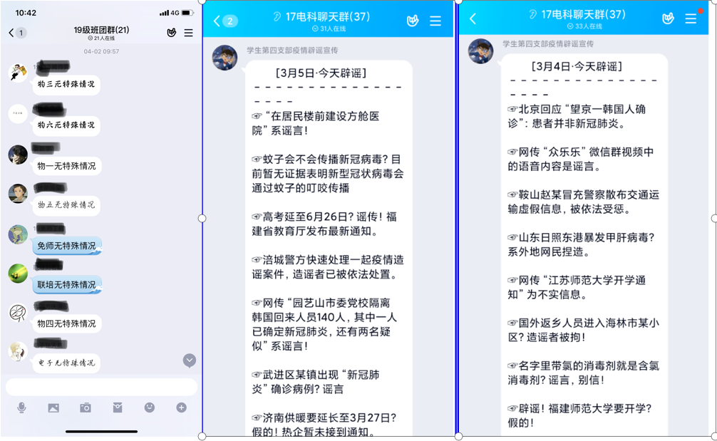 思想引导,坚定学生信心。各年级辅导员分别主持召开“同心战疫,携手成长”主题线上年级会,提高学生对疫情防控工作的认识,引导学生树立“减少外出就是为社会做贡献”的大局意识,树立“不信谣、不传谣、不受骗”的科学意识,树立“宅而不慌,以读攻毒”的学习意识,做好学生思想教育和行为规范工作。依托学院网站和微信公众号,制作战疫系列、防疫志愿者系列、线上年级会系列微信,及时报道学院工作,宣传学院“战疫”成果。全体辅导员通过视频会议、年级群、微信、易班等形式发布疫情权威信息和战“疫”先进事迹,随时关注有关疫情的网络舆论情况,引导大家正确看待疫情,激发学生爱国情感,坚定抗疫必胜信心,凝聚疫情防控向心力。