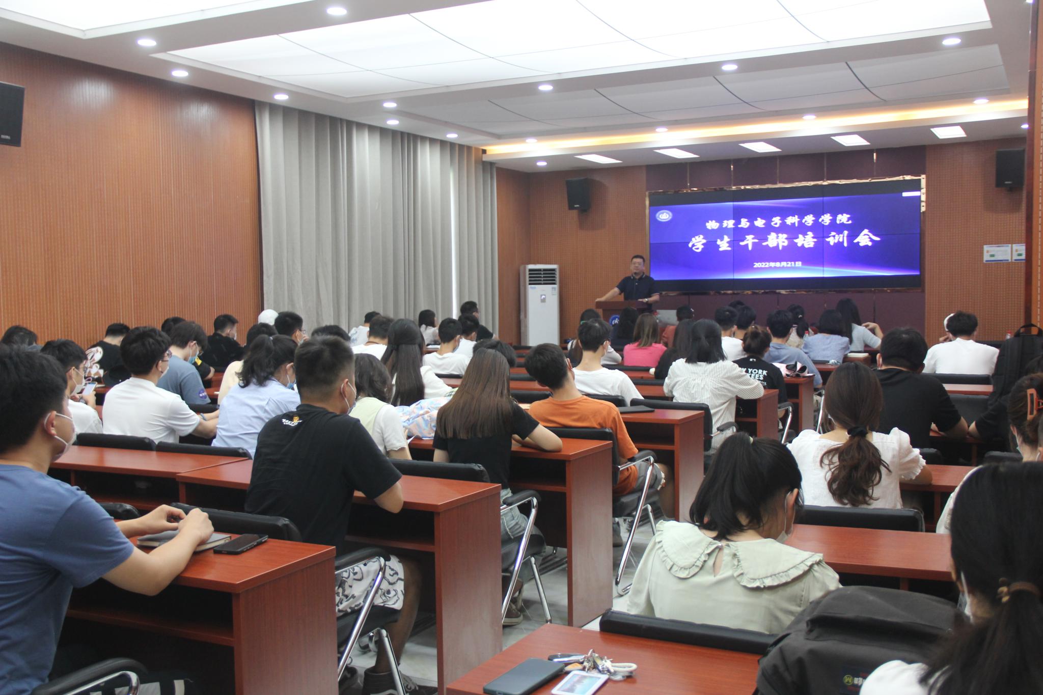 为进一步强化学生干部队伍建设,提高学生干部的综合素质,更好的推进学生工作的健康稳定发展。8月21日上午,物理与电子科学学院于文澜楼F347召开学生干部培训会。学院团委书记周勇、全体辅导员出席本次会议,学院学生会干部及各班班长、团支书参加本次大会。本次会议由18级辅导员方芳主持。