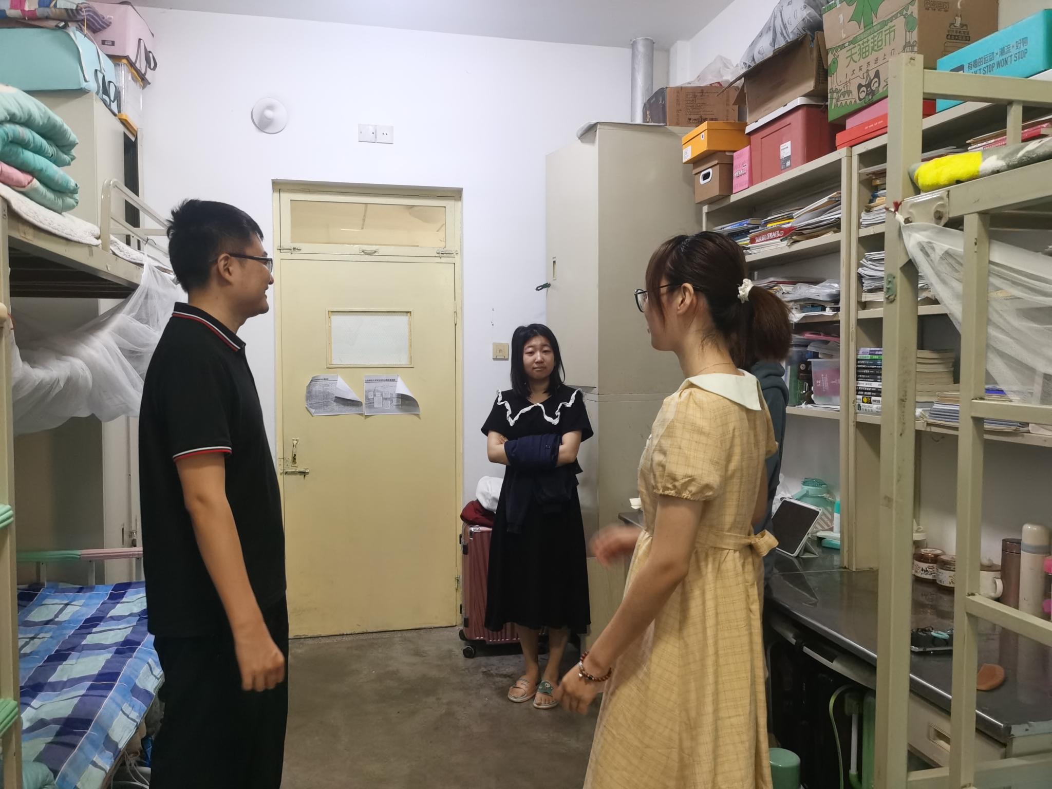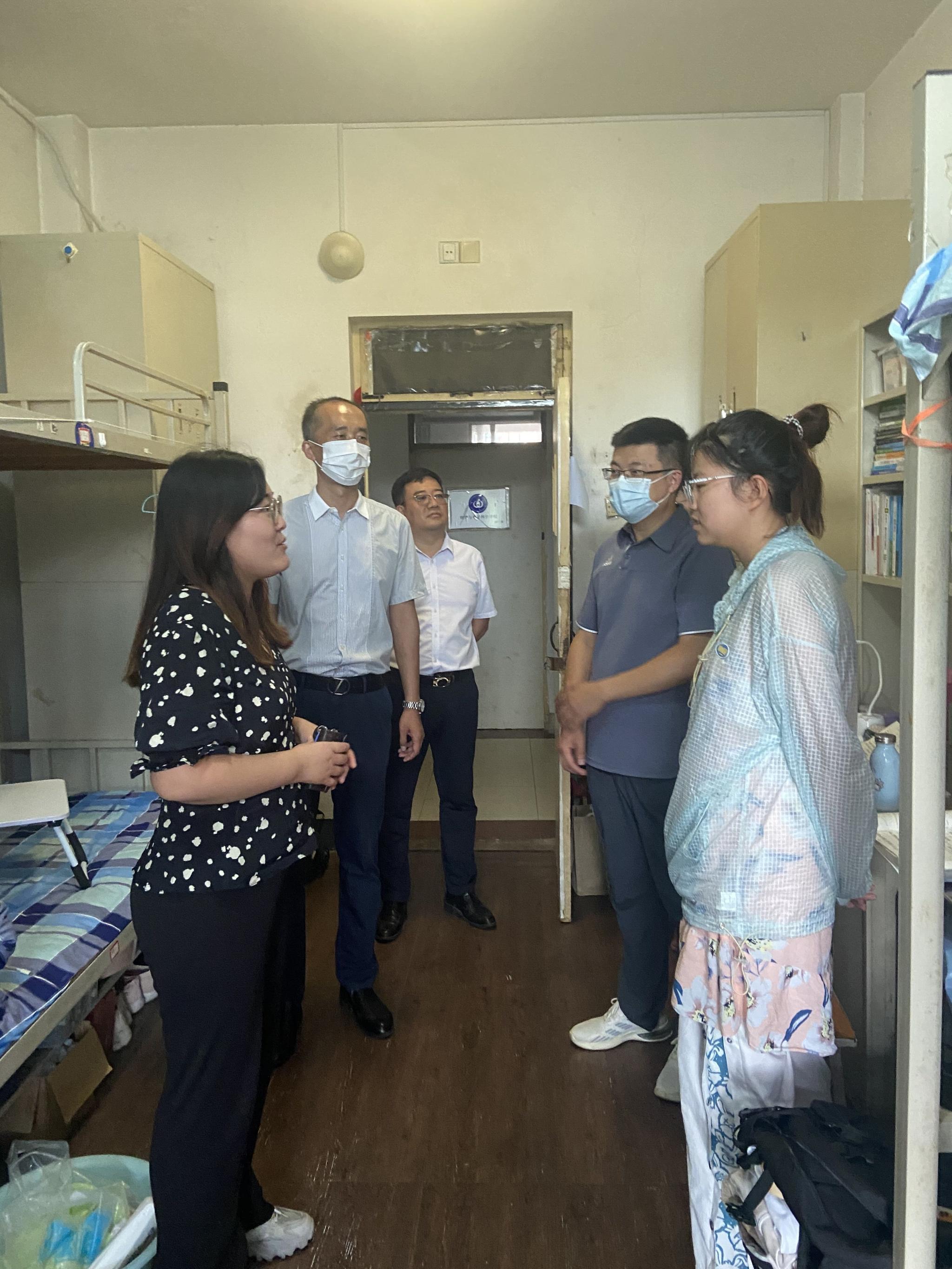 在学校封控期间,为更好了解学生学习、生活、心理等状况,学生工作部学生管理科科长孟庆凌、学院党委副书记杜伟、校团委副书记周勇、全体辅导员分别于9月4日、9月5日前往本科生、研究生宿舍,走访关怀学院学生日常生活及线上学习情况,并对宿舍疫情防控工作进行检查。