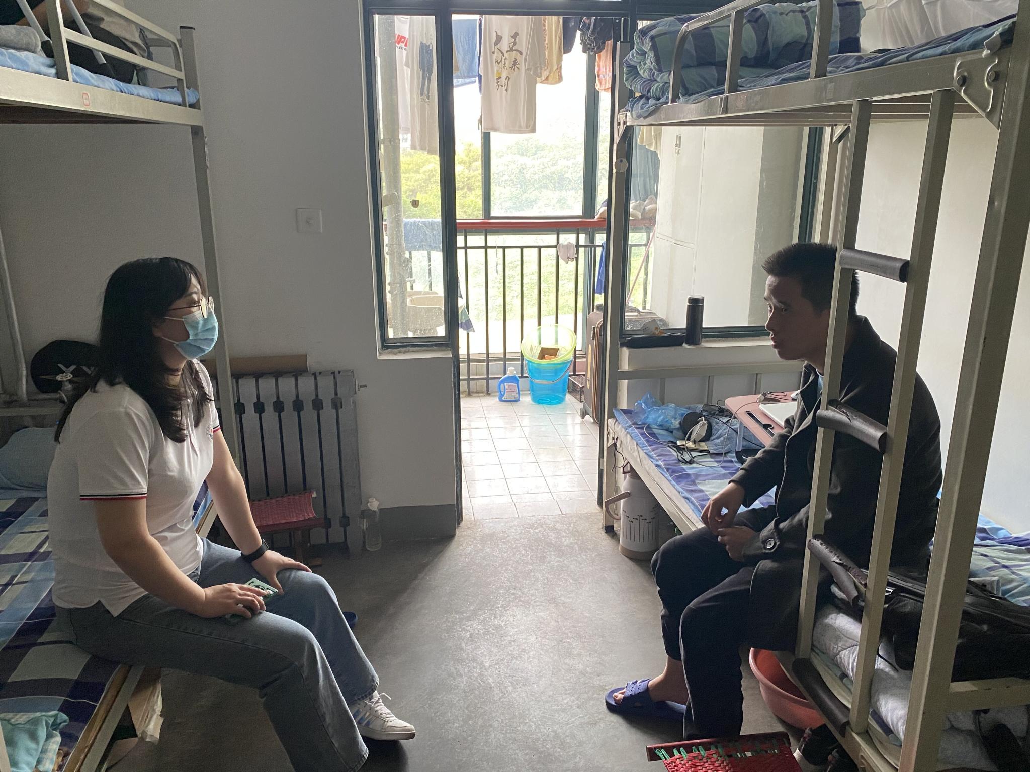 在学生宿舍,走访领导老师与同学们亲切交谈,查看学校封控后学生在学习、生活、心理等方面的情况。在新生宿舍,杜伟、周勇、尹素月细心询问了新生来校后的生活适应情况以及军训情况,叮嘱同学们封校期间按照学校要求完成核酸检测,保持健康的生活作息和良好生活习惯,并耐心为大一新生们答疑解惑。针对大四毕业年级,杨岚、于双阳鼓励学生积极参加考研,坚定考研信心,持之以恒,久久为功。对于想就业的学生,着重与他们进行就业形势分析和就业规划指导,鼓励他们尽早就业。史睿、张雨辰对学生网课情况进行了重点检查,多数学生反馈比较适应,但部分学生反映线上上课存在网络卡顿、画面调整不当以及上课互动性差、交流不便等问题。辅导员建议其可以去教室、图书馆学习,提高效率。通过走访,学生们普遍心理状态比较稳定,能够在学生封控中按部就班进行学习生活,并严格落实学校要求。在走访中发现部分宿舍卫生有待提高,辅导员要求他们尽快整改,保持良好的宿舍卫生。