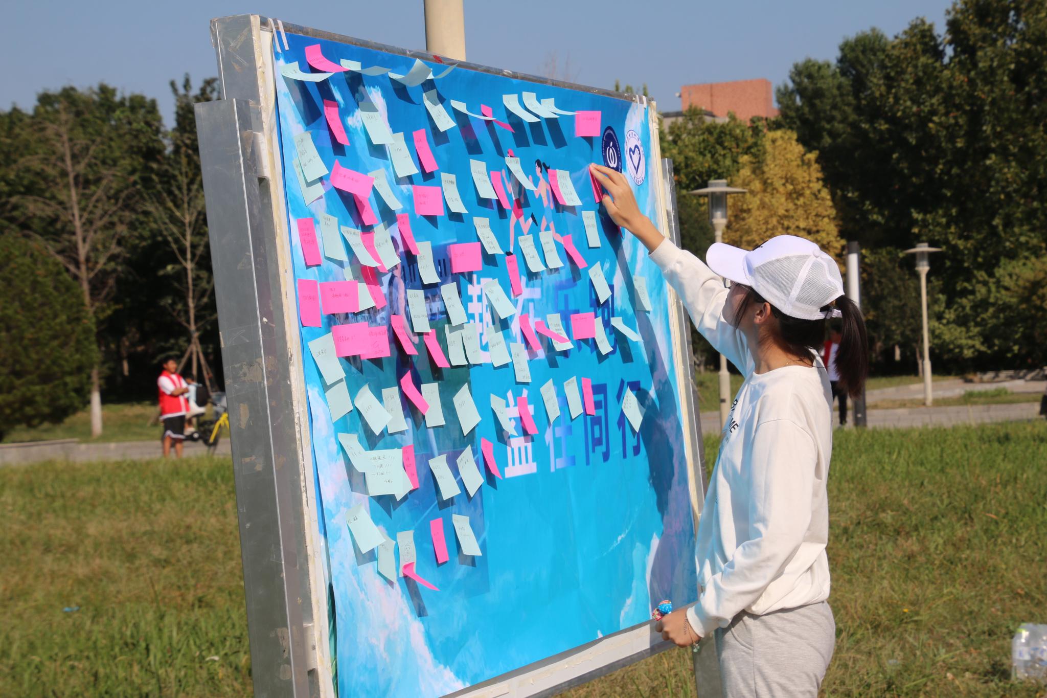 “趣味乐跑”活动由体验盲人世界、两人三足、背靠背拥抱、志愿知识问答、闯关打卡拍照五个小游戏组成,前来参加的同学两两合作,共同配合完成闯关任务。几个马扎,几根长线,简简单单的小道具组成了体验盲人世界游戏,小组间一人用眼罩蒙住双眼,另一人于旁侧进行语言指挥,扮演“盲人”的同学需要听从队友指令,依靠彼此间的信任穿越重重障碍走至终点。两人三足游戏里,搭档之间相互扶持,各出奇招,跌撞坎坷前行中使二人的默契逐步得到升华。在背对背拥抱这一关中,同学们小心翼翼用背夹着气球适应对方的步伐与节奏,走过曲折蜿蜒的道路最终安稳地将气球运至终点时相视而笑,尽显胜利的喜悦。一张纸条,一个问题,在志愿知识问答这里,同学们能在学习浅易知识的同时,对志愿服务获得更深的了解。当参赛成员成功通过以上所有关卡,便可在便签上写下心愿,与志愿者们合影留念并获得一次抽奖机会,广场上欢声笑语不断,幸福与快乐在此刻无限蔓延,“趣味乐跑”活动在志愿者忙碌身影中落下帷幕,活动展板被五颜六色的便签纸贴满,组成了一幅充满无限希冀的美丽画卷。