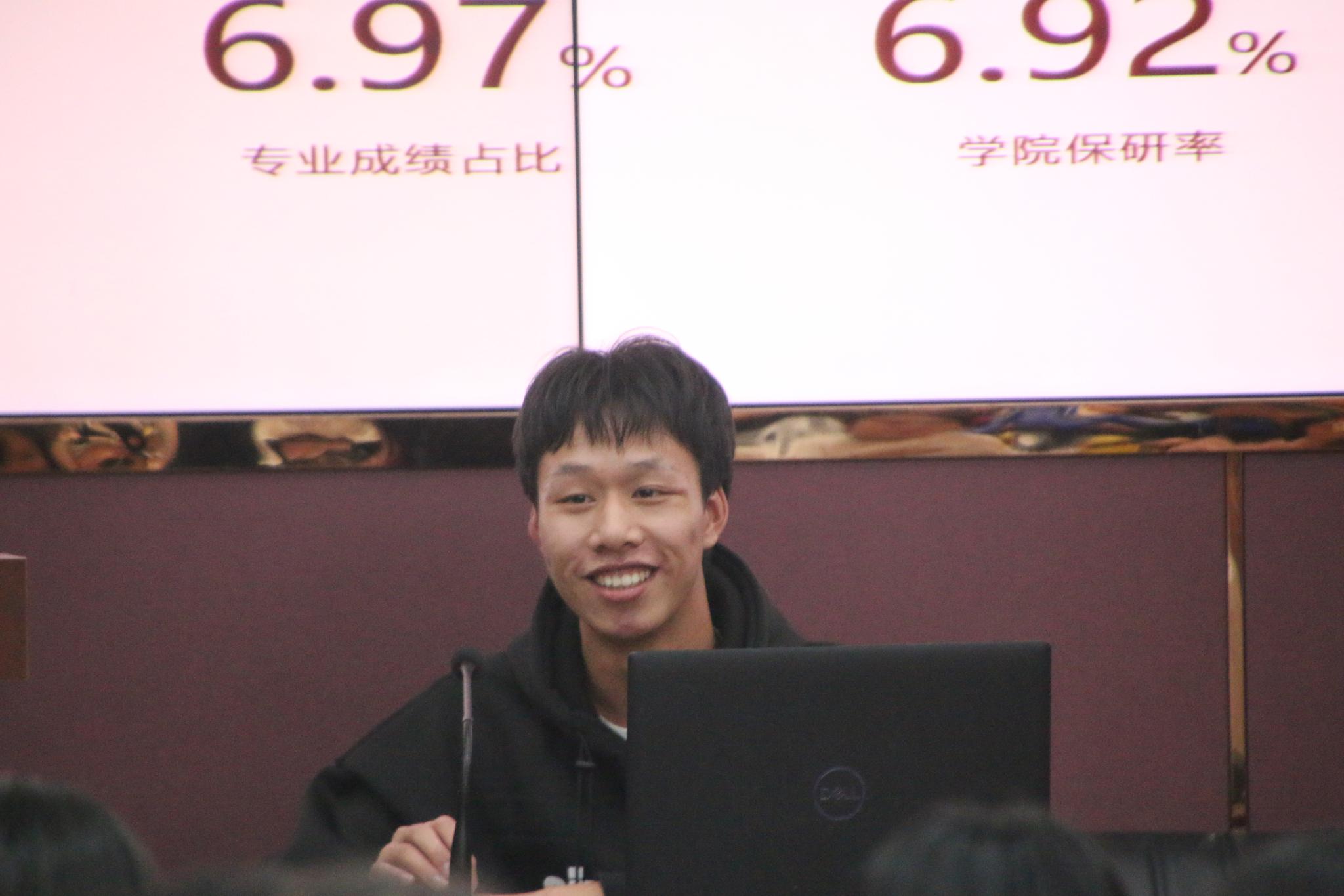 成功保研至中国科学技术大学的叶昊,围绕保研名额分配、保研推荐条件、推免流程介绍、面试考察四个方面进行介绍,他指出时代竞争下保研愈发困难,且许多高校对英语六级成绩要求较高,建议同学们尽可能提高英语成绩的同时慎重选择导师和就业方向,时刻关注梦校官网发布的信息。推免同校的潘瑞萱聚焦全面发展成绩与创新创业成绩计算方式进行补充,她结合自身学习、推免经验提醒同学们要重视专业基础问题,有针对的回顾已学知识,做到全面复习。保研至北京邮电大学的刘瑞,华中科技大学的赵雅哲,复旦大学的陈思颖,分别以整体规划、保研资格的获得、学科教学专业保研为切入点,对保研中最常用到的专业知识进行了简单阐述,着重强调科研经历在其中的重要程度,鼓励保研边缘人积极调整心态,做好两手准备。推免本校的丁柯对支教团计划和硕士计划的基本要求做了细致介绍,并对一些相关竞赛进行解读,为保研提供新思路。刘极则立足自身保研和备考经验,指出准备相关资料、了解考研流程、尽早联系导师、从各种渠道搜寻梦校保研信息等都成为他保研至电子科技大学的“加速通道”。在同学提问环节,大家就跨专业保研等其他方面提出自己的问题,保研学生们耐心解答,认真讲解,为低年级同学提供了详细的信息和方案。