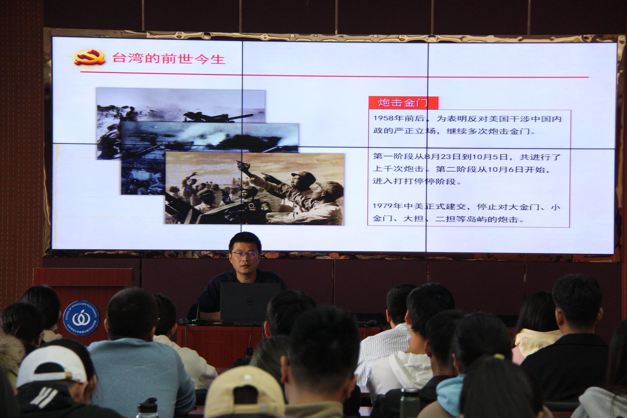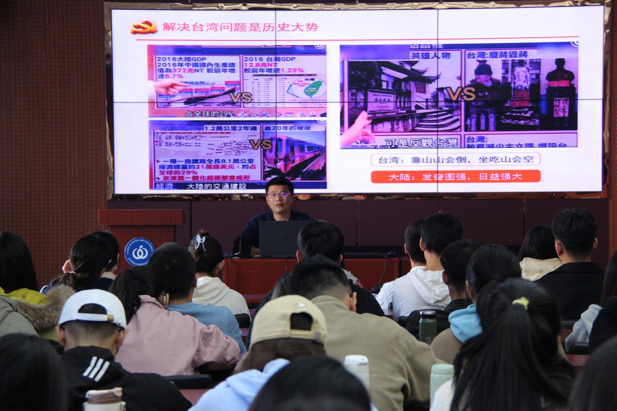 杜伟围绕台湾的前世今生、解决台湾问题是历史大势、台湾发展现状三方面展开阐述。以台湾历史过往为切入点,他表明,在三国、唐末宋初时期,台湾就已经与大陆有频繁的联系,虽然台湾与大陆分分合合,但台湾始终是中华人民共和国不可分割的一部分,中华人民共和国是国际上唯一合法的中国代表政府。结合佩洛西访台事件,杜伟表示,台湾问题一直是中美关系当中最敏感、最核心的问题,美国多次以各种手段干涉中国内政、和台湾亲近,这完全是非法的、无效的。基于此,他结合台湾与大陆不同的道路走向,向同学们介绍二者的发展现状,他强调,随着祖国的发展,大陆发奋图强、日益强大,台湾必须会回到祖国的怀抱。活动最后,杜伟寄语同学们要像党一样坚持敢于斗争,敢于胜利,从容应对挑战,在斗争中发展,在斗争中壮大。