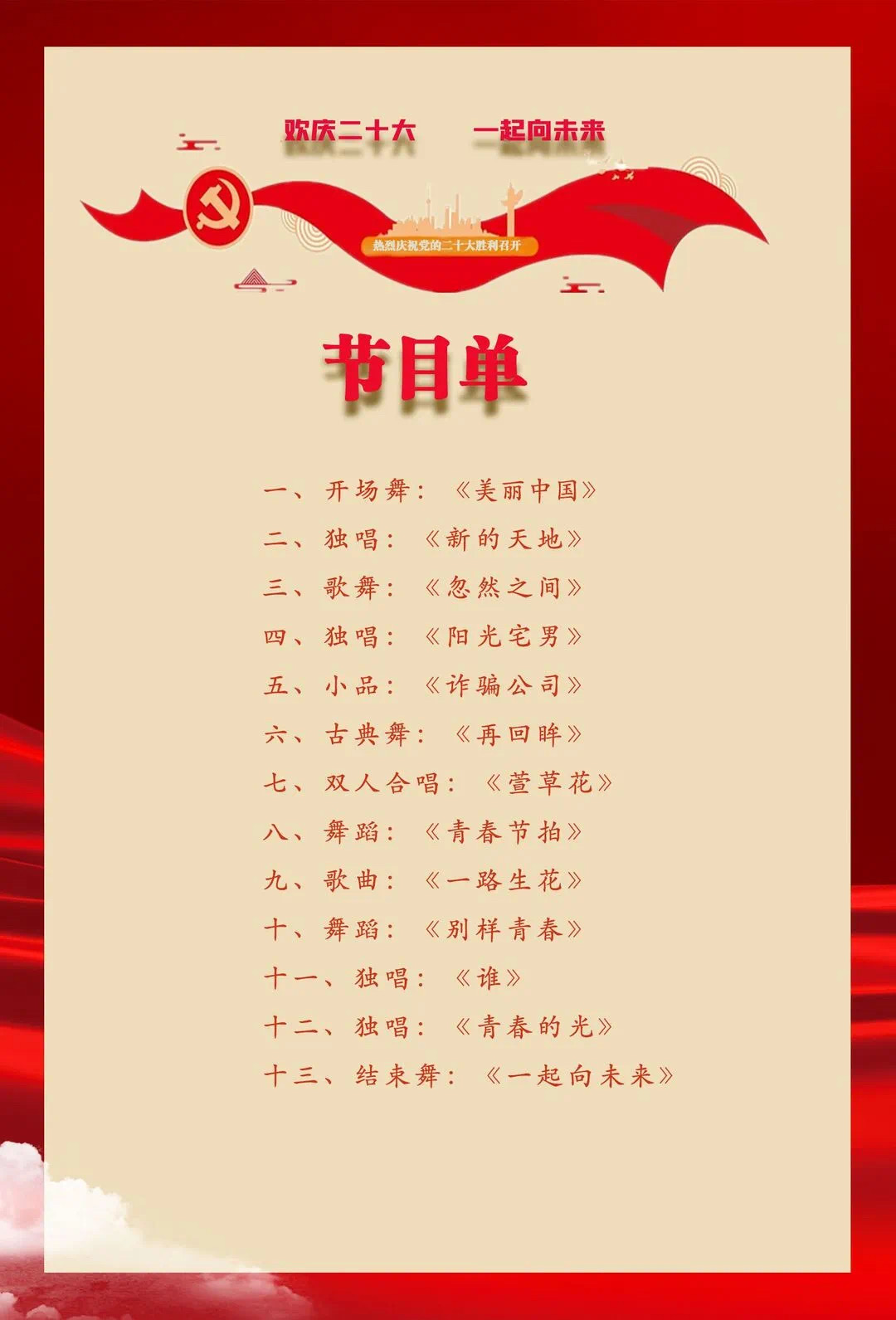 二是学院将举办以“欢庆二十大,一起向未来”为主题的迎新晚会,在迎接学院新同学的同时,勉励同学们以永不懈怠的精神状态,永不停止的前进姿态,用真诚的信仰并肩携手向未来前进。
