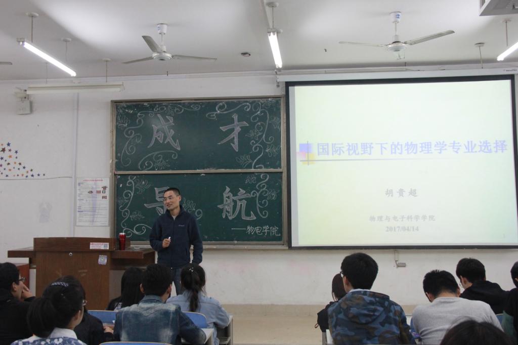为开拓同学们的国际视野,正确认识物理学的前景,4月14日,物理与电子科学学院于长清湖校区C区综合教学楼216室举办成才导航活动。由主讲人胡贵超副教授做“国际视野下的物理学专业选择”主题报告,三百余名学生到场参加。