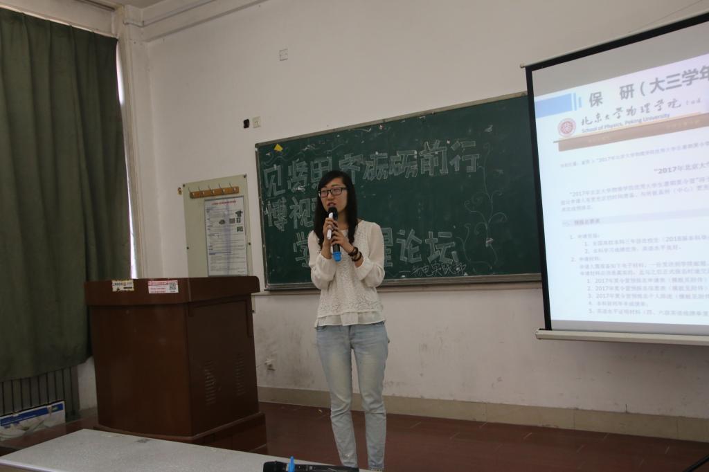 来自2013级电子信息工程一班董苏惠首先分享了自己的经验。她结合自己的经历,以“纸上得来终觉浅,绝知此事要躬行”等五句名言为主线,传达了学无止境的观念。接下来,2014级电子信息工程班包希浩分享了自己在竞赛、做班委、考研或就业的选择以及课余生活几个方面的心得体会。他告诫同学们:“尽管大学期间总会有不圆满之处,但是我们依然要努力不留遗憾。”接着,2014级电子信息工程一班刘子函总结了大学期间同学们能够参加的竞赛并做简要介绍。2014级电子信息科学与技术班董尧对这些竞赛进行补充说明,重点阐述了如何找导师和写大学生创新创业训练计划项目立项申请书。两位师哥师姐所讲内容使同学们对自己大学期间想参加的活动有了更多了解。最后成功保研北大的2013级物理二班韩旭讲述了自己保研的经历,她强调:“如果想保研从大一就要开始准备,必须保证成绩在年级的前十左右才会有希望。”韩旭还分享了面试的经验,给学弟学妹树立严谨求知的榜样。会后,每一位同学都留下了自己的联系方式,便于以后为师弟师妹答疑解惑。