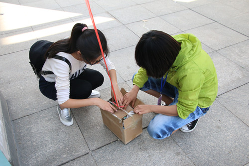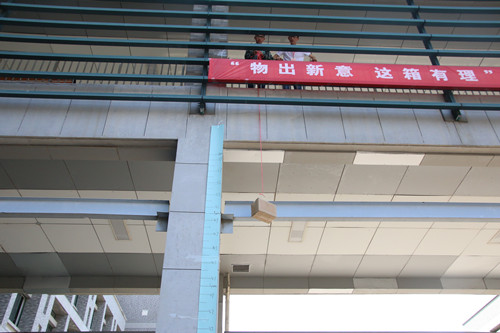 活动通知一经下达,便得到了同学们的积极响应,共有来自各个学院的一百余组同学带着自己的构思巧妙、创意独特的设计参加了此次比赛。同学们使用统一的纸箱以及限定的纸质材料,进行内部结构改造, 并使用规定的易碎物品按照编号依次进行测试。首先进行的是抗摔测试,选手根据作品情况自由选择起始高度(大于等于基础高度1.5米),每20厘米设置一个高度档,进行多次测试。其中,第二组第19号美术学院的同学把箱子内部的纸筒做成倒三角的形状,以增大缓冲,减小作用力,成功使纸箱内四个玻璃瓶从6米的高度落下而没有损坏。若箱子内部物品没有损坏,则继续进行抗压测试,选手根据作品情况自由选择起始承重重量(大于等于基础承受压力50牛顿),每10牛顿设置一个重量档,多次进行测试。第十组第103号物电学院队伍,他们利用胶带以及厚的纸张做成牢固的纸筒包裹玻璃瓶,利用三角形最稳固的原理,用竖纸板支撑对角线,四周用厚纸板填充,并利用四个三角形纸板进行封装,成功通过了最大压力测试。最终,评委依据评分公式求出顺利通过两次测试的队伍的评测总分,依据总分进行排名,评选出了第63号、85号等10支优秀队伍进入决赛。