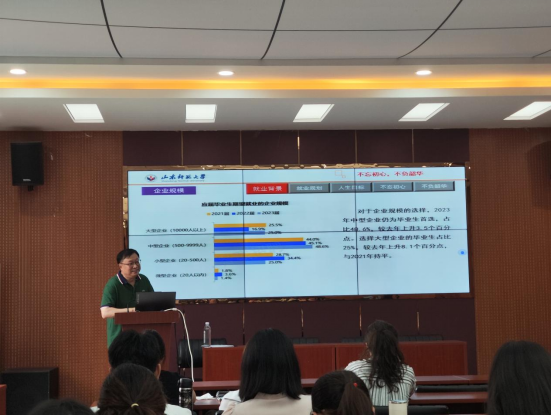 李健教授从就业背景、就业规划、人生目标、不忘初心、不负韶华五个方面开展此次讲座。通过详细分析应届毕业生就业去向、岗位偏好和企业规模来拓宽同学们的就业视野和就业思路。李健教授还举出不同实例来印证人生目标对于个人发展至关重要,激励大家树立正确的择业观和人生观。最后,教授勉励毕业生们不忘初心,始终坚持本我,以良好积极的心态面对前方的路。报告结束后,李健教授对现场听众的提问进行耐心解答,十分细致且生动地为同学们传授了很多专业知识和学业上的宝贵经验,帮助大家对未来的路有了更清晰的规划。