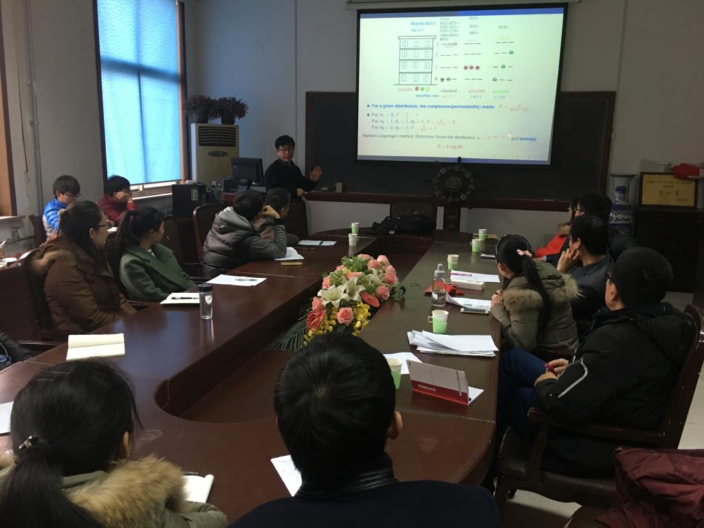 应物理与电子科学学院邀请,中国科学院武汉物理与数学研究所管习文研究员于2017年1月5日-8日对我院进行了访问,并于6日下午以“精确可解模型:多体物理之美”为题在千佛山校区教学二楼物电学院会议室举行学术报告会。报告中,管习文研究员介绍了他们近年来对有关低维量子多体系统的严格解、统计物理模型、自旋体系和电子强关联体系等方面的研究,深入浅出地阐述了一些基本的物理概念在物理学研究中的应用,同时结合一些多体问题的求解揭示了科学研究过程中所隐含的物理美,并热情回答了师生所提出的问题。报告会由孟庆田教授主持,宋玉志和李宗良副教授及其他研究生导师和学生听取了报告并与管习文研究员进行了交流。