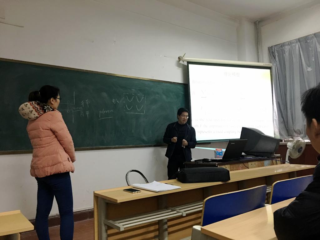 李晶在报告中介绍了元胞自动机的发展历程和相关理论模拟,特别是在激子极化激元半导体微腔中,利用耦合谐振腔的双稳态,通过耦合腔之间的相互作用,成功模拟了由110规则定义的元胞自动机,并通过数值求解非线性Schrödinger方程,描述了该系统的动力学演化过程。报告期间李晶博士同与会师生进行了热烈的讨论交流,使与会师生受益匪浅。