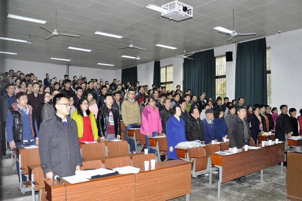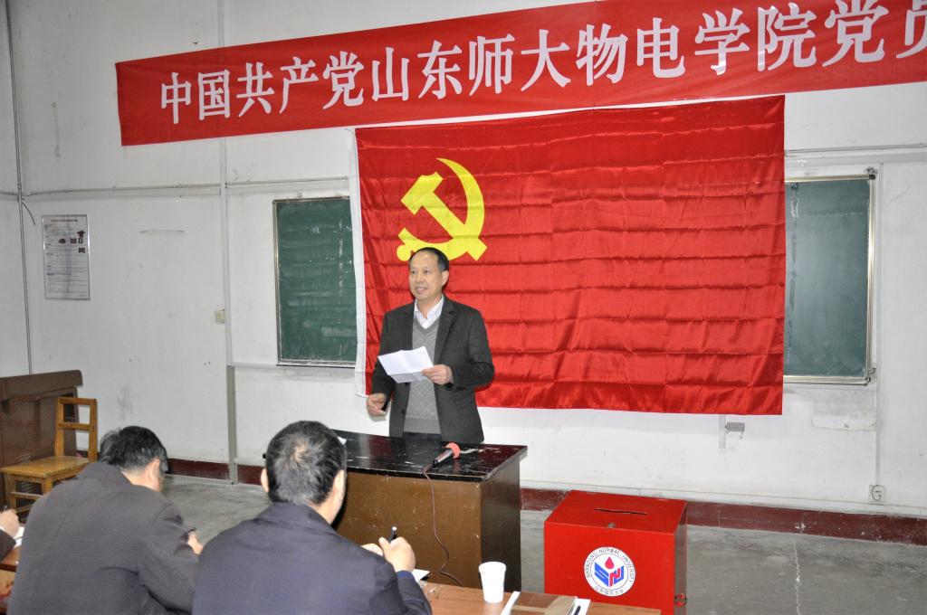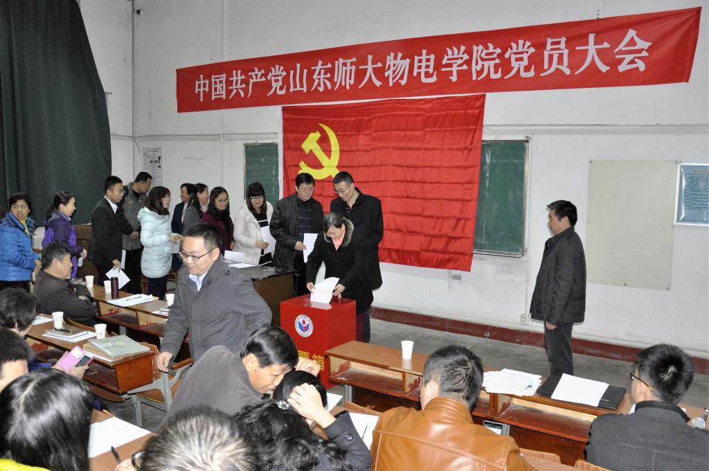 11月10日下午,千佛山校区教学二楼2214阶梯教室里,座无虚席,“中国共产党山东师大物电学院党员大会”的大红条幅下悬挂着鲜艳的巨幅党旗,镰刀斧头组成的党徽格外艳丽,引人注目。物电学院党员大会在雄壮的国歌声中拉开帷幕。