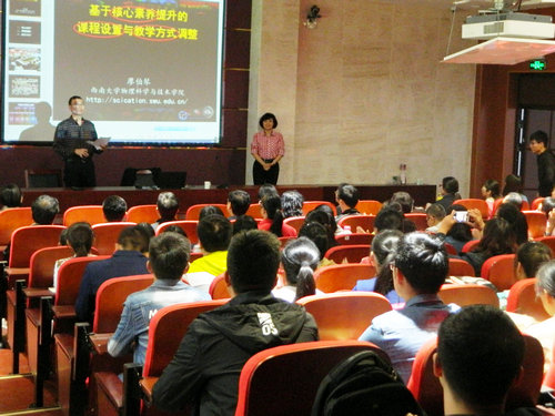 教学三楼3153教室内座无虚席。报告以“基于核心素养提升的课程设置与教学实践” 为题,廖伯琴首先介绍了中国学生发展核心素养的基本结构,从文化基础、自主发展、社会参与三个方面进行了全面系统的阐述,并基于核心素养,结合物理学科,从其概念、属性、探究方法等方面进行了全面深入的解读。接着,廖教授根据我国中学教育现状,就如何在中学教学实践中提高学生的核心素养,论述了几个行之有效的课程设置方案。最后,廖教授针对中学教师在教学方式上容易忽视或常见的一些问题,以实例为证解读了六大素养应如何在课堂中渗入。比如一节公开课的引入,该用什么演示来抓住学生的好奇心,然后如何回应引入,以解学生好奇之渴。通过上课老师的不同引入对比,以及对老师的每一句话解析,使人顿感廖教授的思想引人入胜,听后如食甘栗,令人回味无穷。