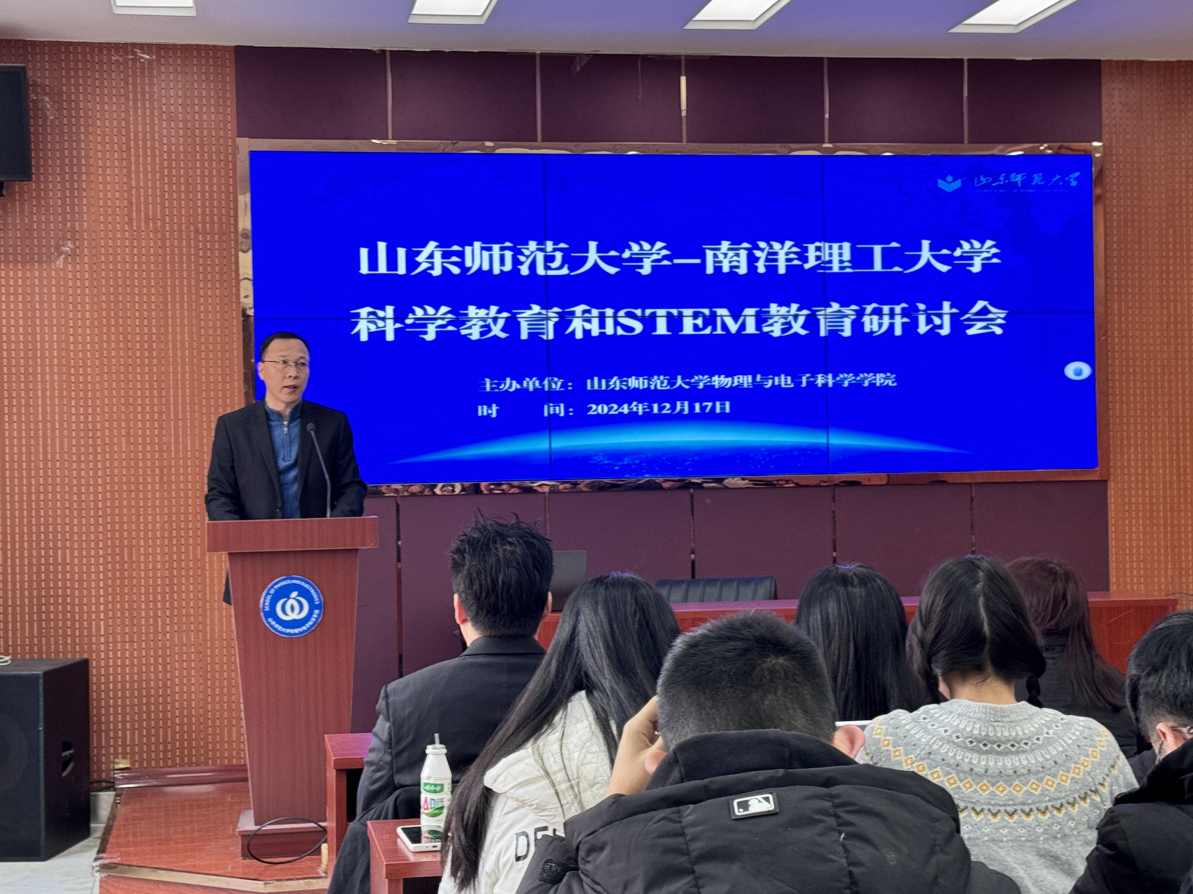 12月17日,物理与电子科学学院科学教育与STEM教育研讨会在文澜楼A区F347举办。研讨会邀请了新加坡南洋理工大学国立教育学院张丹玮(Teo Tang Wee)、陈逸玲(Tan Aik Ling)、莊伟明(Edwin Chng)三位教授进行报告分享。学院副院长宋玉志、科学与技术教育学位点负责人高守宝、济南市市中区教育教学研究中心科学教研员郑会战出席此次研讨会。