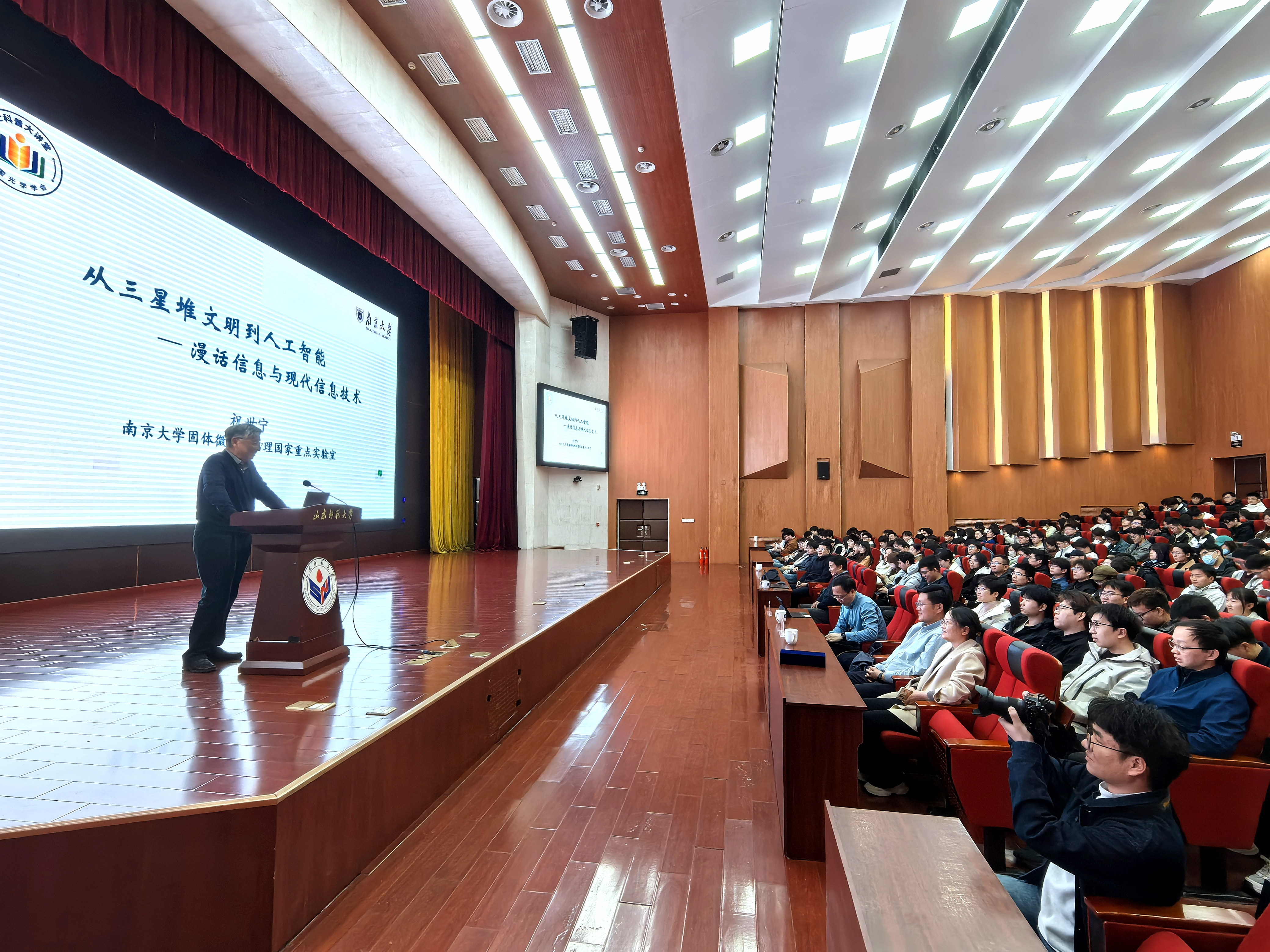 祝世宁院士作题为《从三星堆文明到人工智能——漫话信息与现代信息技术》的学术报告。他以文明演进史为经、信息科学为纬,开启了一场横跨文理疆界的认知探索。报告从信息载体的形态嬗变切入,贯通热力学熵与信息熵的内在关联,系统阐释香农信息论的理论框架及其对当代基因编辑技术与大模型革命的奠基性作用。通过对比电信号处理信息的量子化特征与光波传播信息的波动本质,深入解析电磁波承载信息传播的物理本质,进而以DNA双螺旋结构为枢纽,揭示生命密码存储与复制的信息学本质。互动环节中,针对师生提出的专业问题,祝世宁院士结合跨学科研究案例,逐一给予兼具理论深度与实践价值的解答。此次报告不仅打通了基础理论与工程应用的转化链路,更通过信息科学视角重构生命认知范式,有效拓展了交叉学科研究的思维边界,现场多次爆发热烈掌声。
