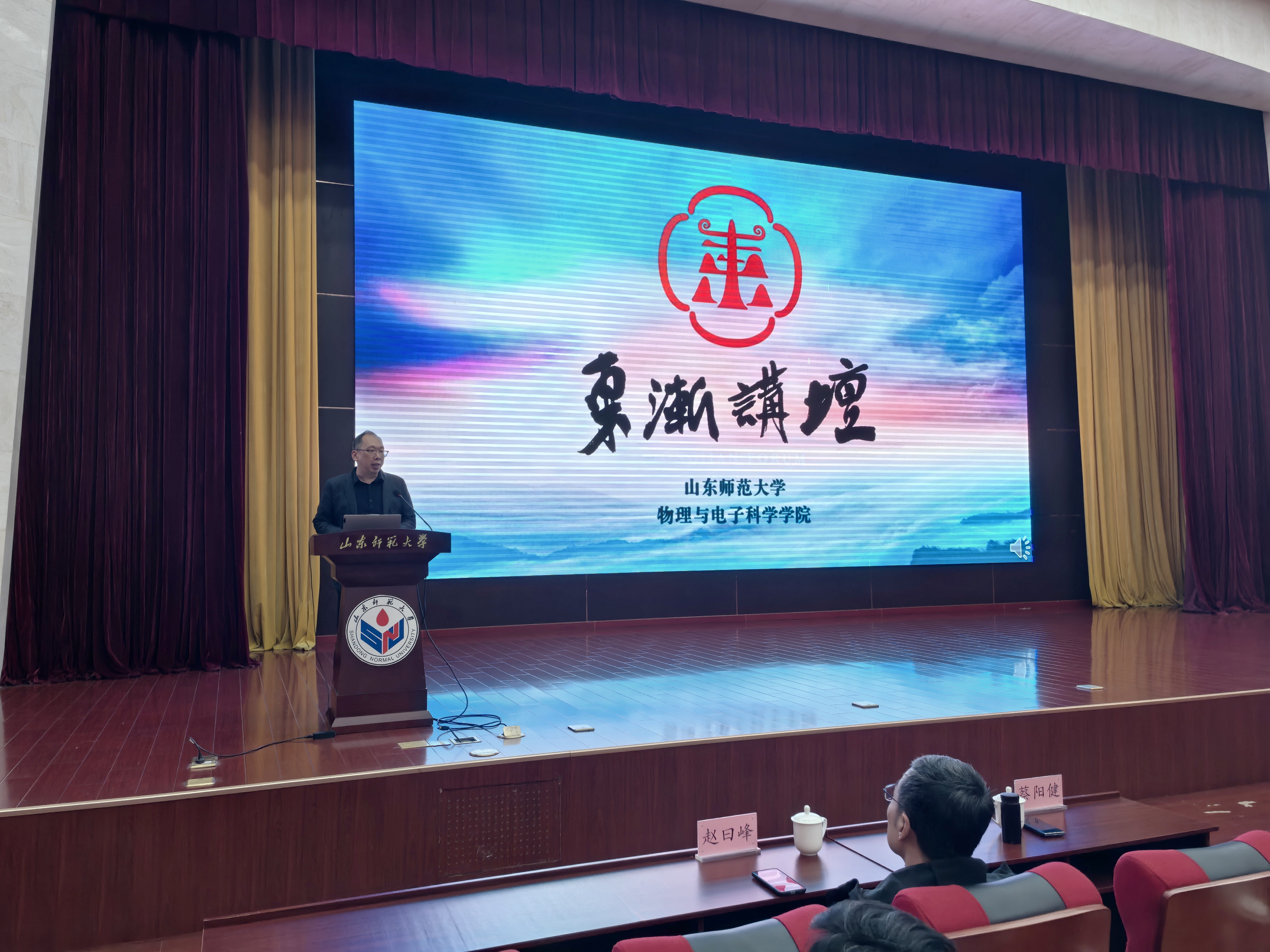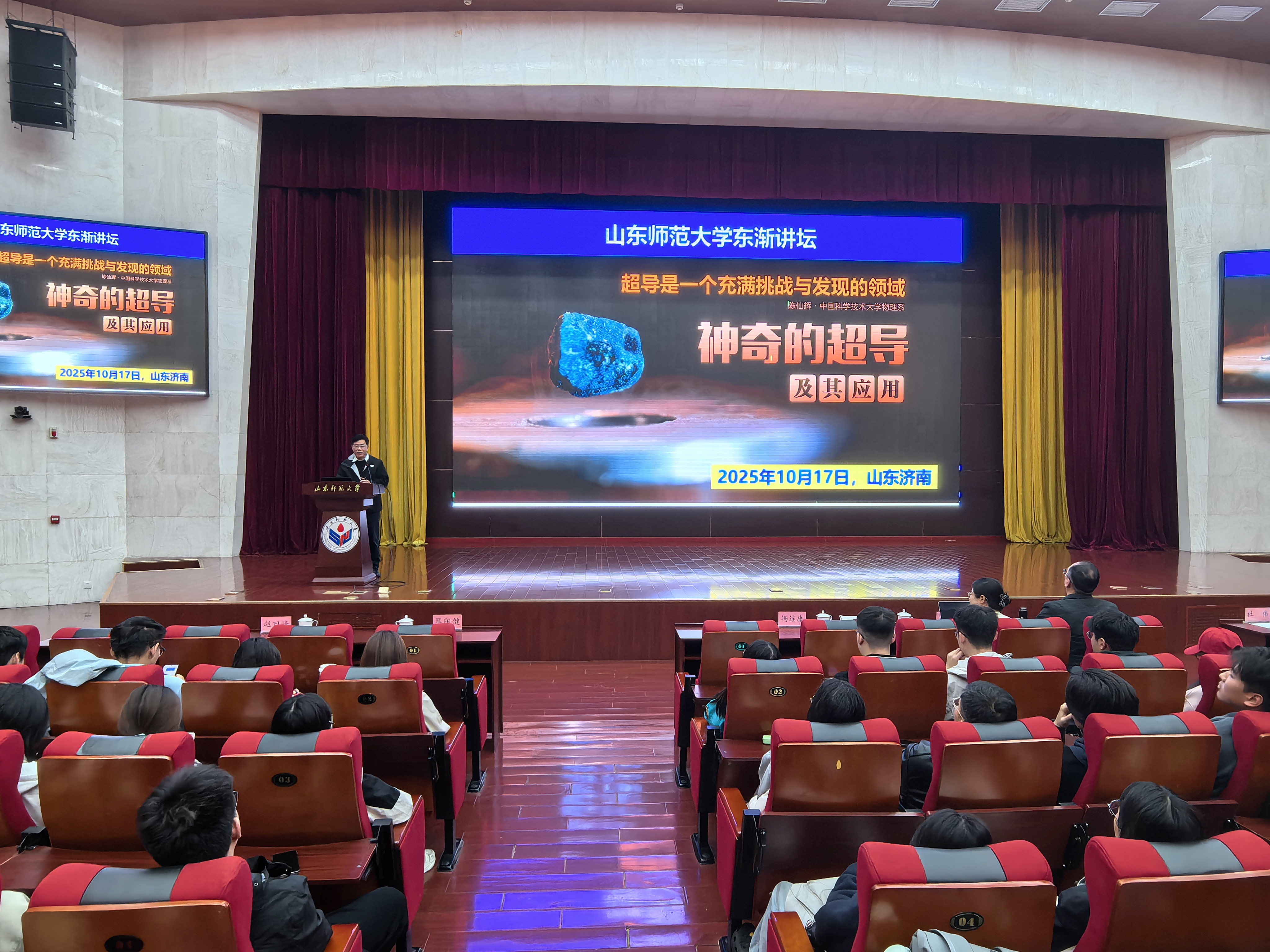 10月17日下午,物理与电子科学学院第29期46讲“东渐讲坛”在长清湖校区树蕙堂报告厅举行。本次讲坛特别邀请中国科学院院士、中国科学技术大学教授陈仙辉担任主讲嘉宾。山东师范大学党委书记冯继康为陈院士颁发“东渐讲坛”纪念奖杯,副校长蔡阳健主持了报告会。科学技术处副处长赵曰峰、学院副书记杜伟、副院长王晶晶、相关专业教师、研究生和本科生300余人参加活动。