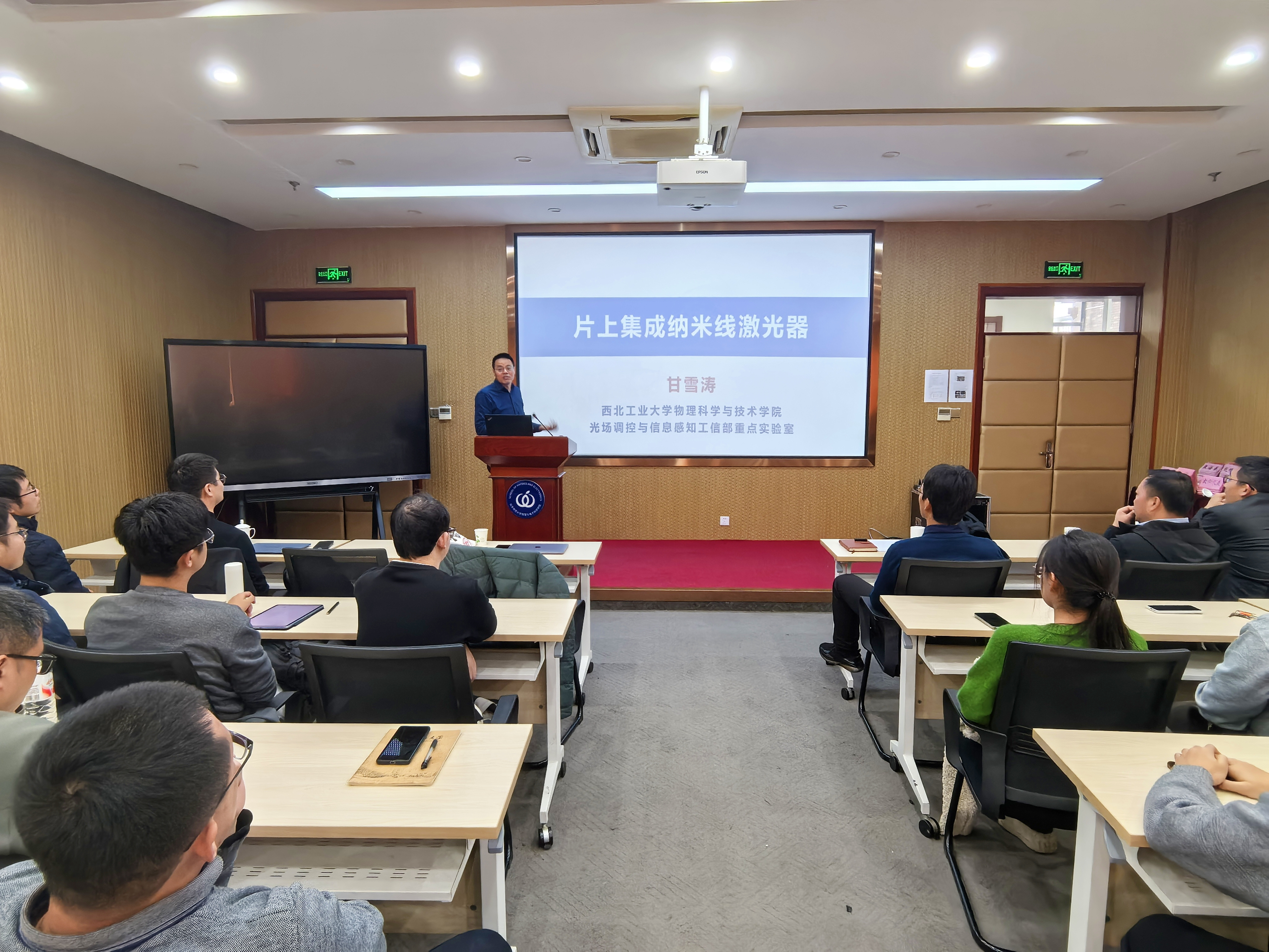 在本次报告中,甘雪涛教授以《模式调控的纳米线激光器及其片上集成》为题展开了精彩的分享。他先介绍了光电集成系统作为新一代信息技术关键支撑的背景,说明半导体纳米线激光器因结构紧凑、易于集成、能耗超低的特点,可解决传统器件晶格失配、CMOS 不兼容等问题,在片上通信、传感、检测等领域具有重要应用价值。随后,他围绕片上前道集成工艺、微环腔混合集成技术及双外腔集成方案等内容展开讲解。报告结束后,甘雪涛教授与现场师生进行了交流互动,对师生提出的问题进行了耐心详细的解答,深化了此次学术交流的广度与深度,受到师生热烈欢迎。本次“东渐讲坛”碰撞出学术思想的火花,点燃了师生对光电子集成前沿的研究热情,为学院相关领域的持续发展开拓了新视野,注入了新动能。