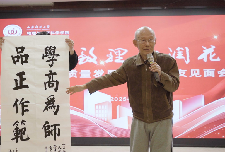 随后举行的捐赠仪式温情而庄重,充分展现了校友们对母校的深厚情谊和反哺之心。1960级老校友潘景年先生向学院捐赠了其精心创作的书法作品,笔墨丹青间饱含着对学院的深切祝福。1986级校友董丰富、1989级校友陈实、2003级校友王申、夏欢等慷慨解囊,向学院“物电励行”校友基金捐款;2003级赵金怀校友为活动捐赠了纪念陶瓷大赏盘,为学院发展注入力量,生动诠释了山师校友心系母校、薪火相传的精神。