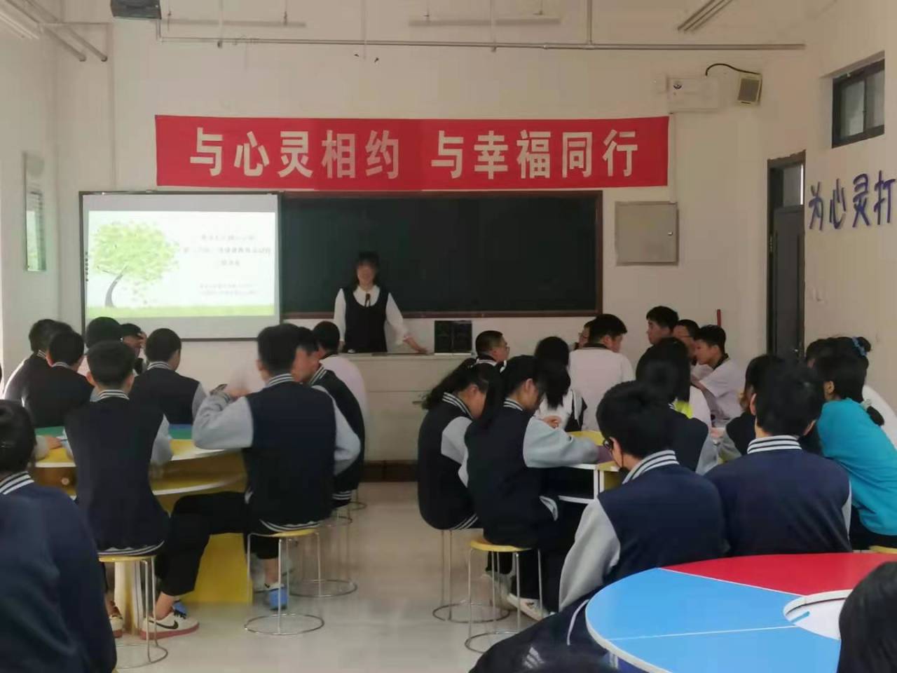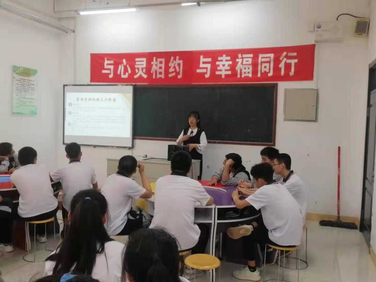 为帮助同学们培养良好的人际关系,提升日常学习和生活的幸福感,星空心理站站长王晓涵同学在实习学校带领学生们进行了题为《与心灵相约,与幸福同行》的班会。