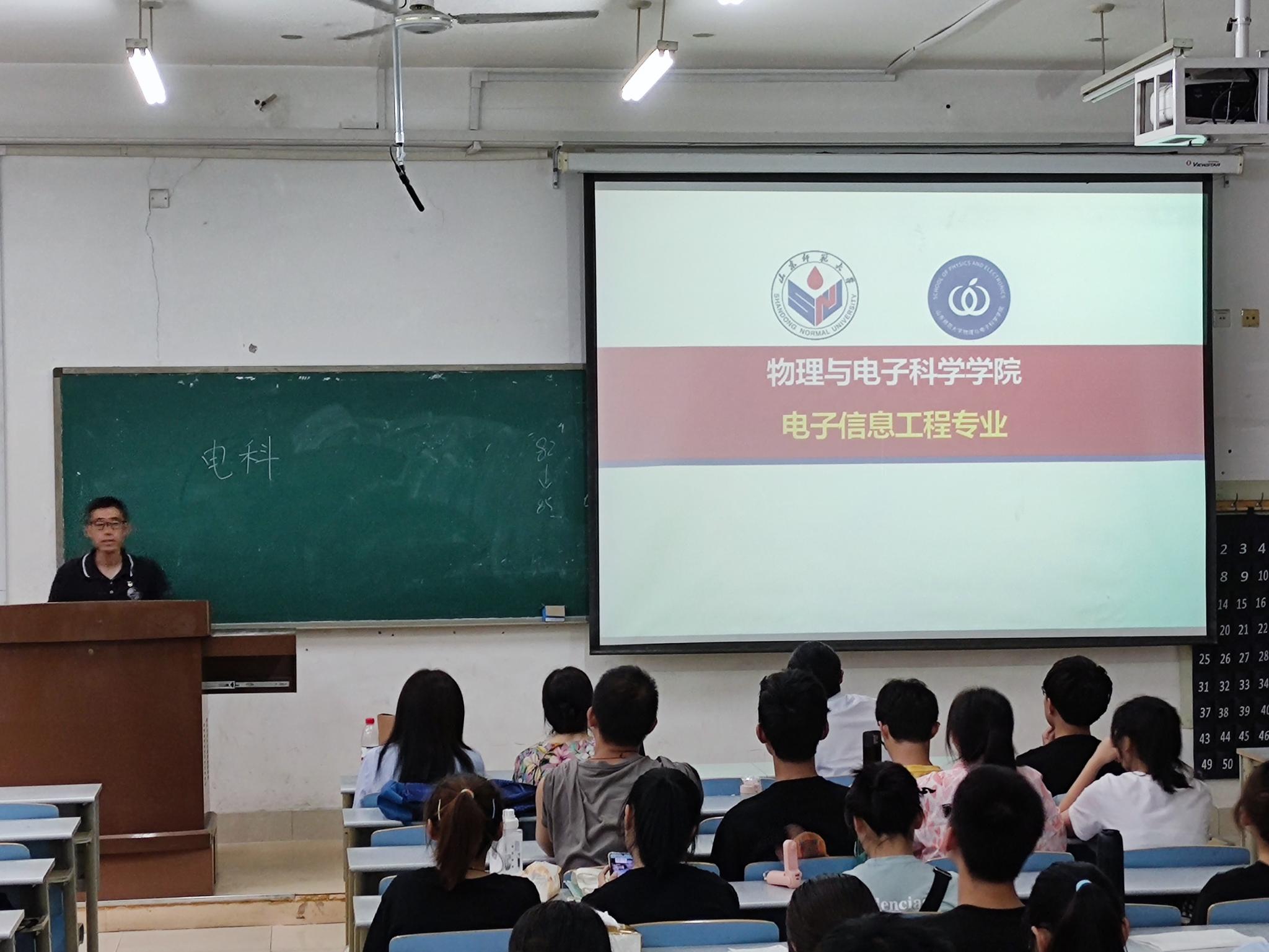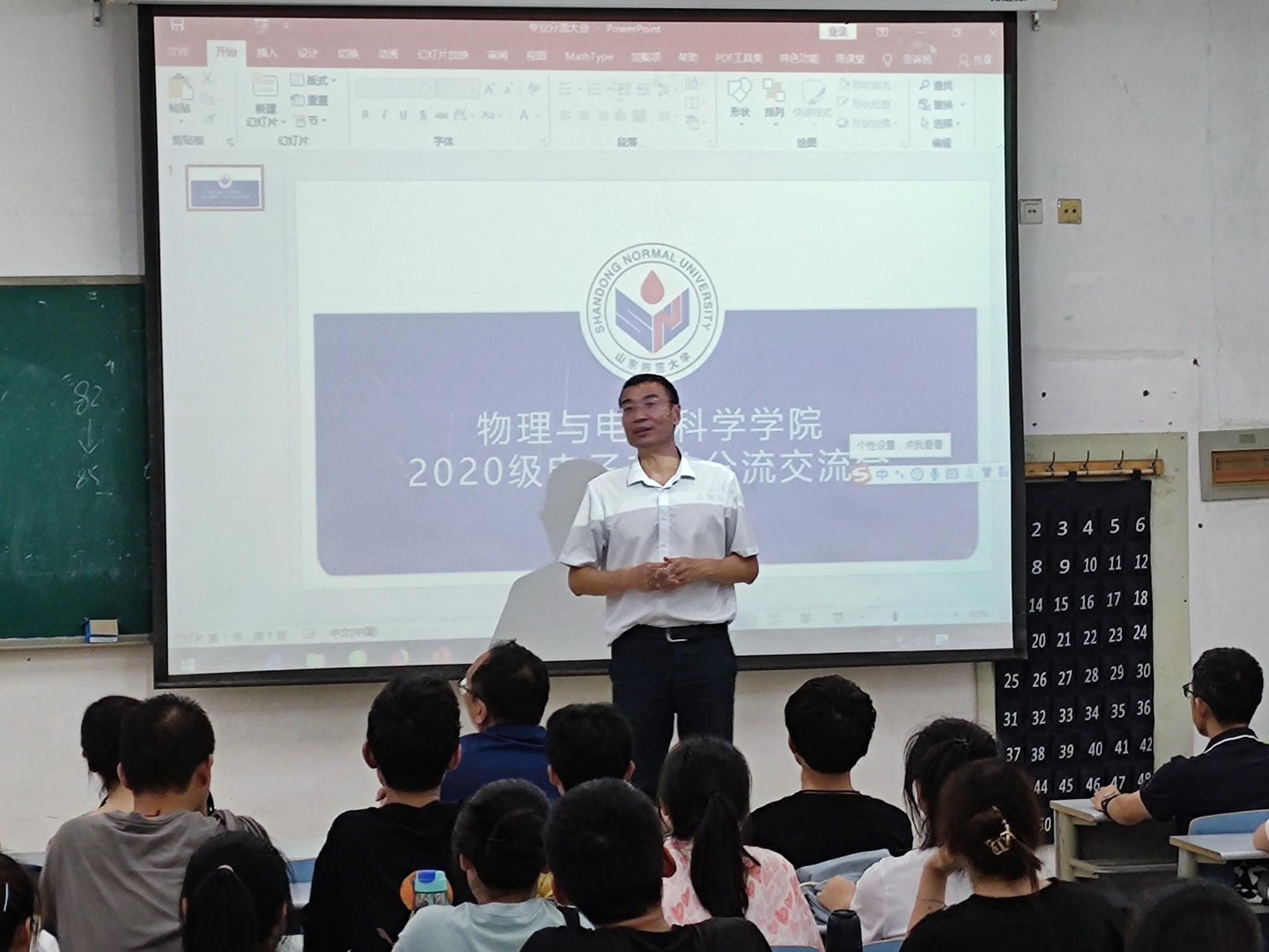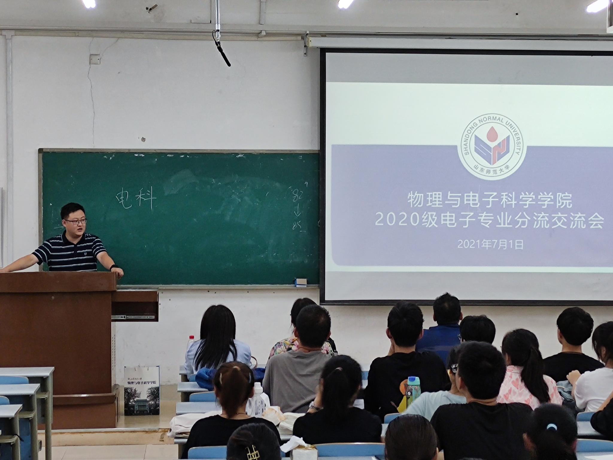 7月1日下午,物理与电子科学学院于长清湖校区文澜楼C224室举行2020级电子专业分流交流会,院长蔡阳健、副院长赵曰峰、光电专业负责人任莹莹副教授、电子信息工程专业负责人岳伟伟副教授、电子科学与技术专业负责人王晶晶副教授出席本次交流会,20级辅导员史睿,2020级全体电子信息类同学百余人参加会议。