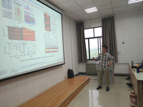 马利波博士在报告中介绍了光学环形谐振腔的制备、性质及应用。光学环形谐振腔能够支持回音壁模式的光共振,在光信号处理,光与物质的相互作用等方面具有广泛研究价值。马利波博士所带领课题组基于自组装制备微管谐振腔平台,研究共振光在微管谐振腔中的调节与控制。通过卷入局域聚集的发光纳米颗粒,可以实现双势阱的光学三维限制。通过直接在集成有波导的衬底上制备微管谐振腔,可以实现衬底集成的微管谐振腔与光波导的耦合。通过引入表面等离子,可以实现共振光与表面等离子体的相互作用。另外, 通过设计利用非常规微谐振腔结构,可以产生光学Berry相以及非整数的共振模式。以上研究对于光信号调节,光芯片集成,光与物质的相互作用,以及光量子信息处理等方面具有很好的应用前景。马利波博士在IFW-Dresden所带领的课题组在光学微谐振腔的基础与应用领域研究方面取得了公认的学术成果。马利波博士在报告会后和与会教师、研究生进行了热烈的讨论交流,受到与会师生的欢迎。