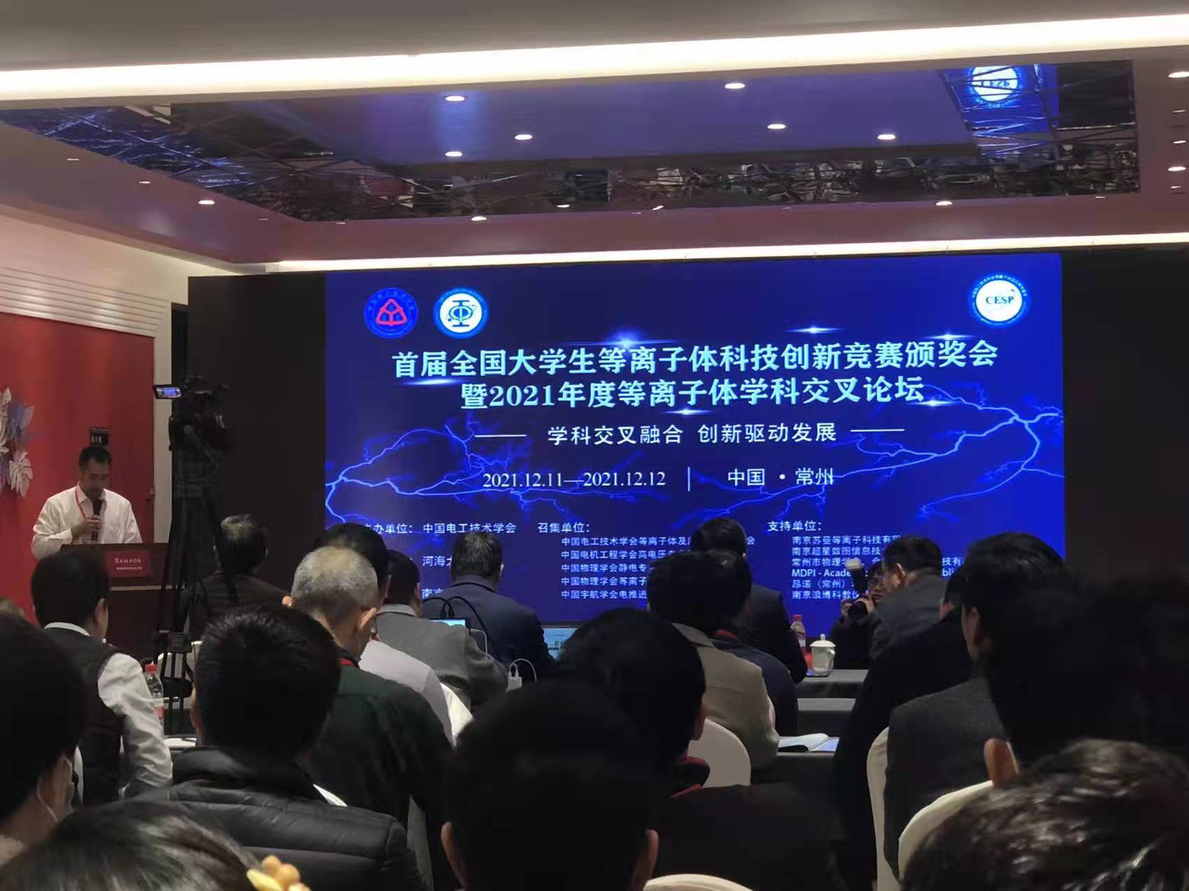 上午八时三十分,大学生等离子科技创新竞赛颁奖仪式准时开始,本次大会以线下会议和线上同步直播的形式召开。会议伊始,由中国电工技术学会韩毅秘书长和河海大学副校长路国宾致辞。电工学会等离子体专委会主任委员邵涛公布获奖名单,并依次进行颁奖。大学生等离子科创赛主席陈秉岩对本次大赛开展工作总结,并举行下届大赛启动和赛旗交接仪式。接着,会议进入第二阶段2021年度等离子体学科交叉论坛。由河海大学理学院院长朱永忠和南京工业大学电气工程与控制科学学院院长方志致辞,西安交通大学张冠军教授、常州市生态环境局总工徐圃青、南京苏曼等离子体科技有限公司总经理万京林和MDPI旗下期刊责任编辑樊远秋发表重要讲话。