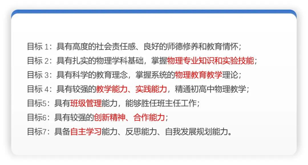 本专业培养掌握物理学的基本原理、基本知识及实验技能,具有创新精神和创业能力,综合素质高,适应基础教育发展需要的,能在高等和中等学校进行物理教学的教师、教育科研人员和其他教育工作者及适应社会发展的物理学专门人才。