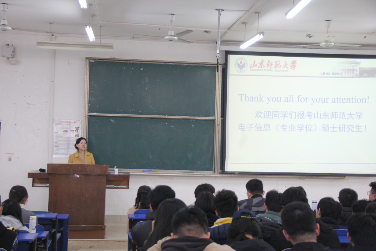 乔建苹老师讲述以信号处理的工程应用信号处理的临床应用中外联合培养研究生为培养特色的光电专业,培育了多批优秀的人才。许化强老师为同学们讲解电子科学与技术(学术学位)硕士研究生报考要求须知。该专业招生分为电子科学与技术(理学)、电子科学与技术(工学)及其下设研究方向(二级学科),包括物理电子学、电路与系统和微电子学与固体电子学。王晶晶老师介绍电子与信息工程专业,该专业以信号处理的工程应用、信号处理的临床应用、中外联合培养为培养特色。电子信息工程类硕士专业学位点前身为电子与通信工程专业硕士学位点,于2011年获得授权、2012年开始招生,2019年工程类硕士专业学位点调整为电子信息专业学位类硕士授权点。宣讲过程中,各位老师就同学们最关心的问题一一解答,并表达了对同学们报考的热烈欢迎。宣讲会在同学们的掌声中落下帷幕。