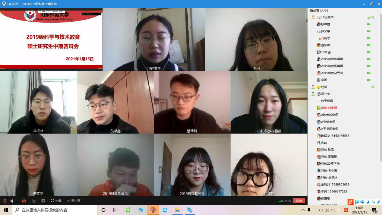 由于受到疫情的影响,学校积极响应国家疫情防控政策,号召学生错峰离校,物理与电子科学学院于1月15日下午举办2019级科学与技术教育专业的线上中期检查。本次检查是为了督促毕业生的论文写作进度,同时也对同学们在毕业论文写作过程中遇到的问题进行统一解答。本次参与答辩的有迟菁华等十二位同学,同时研究生导师李健、王书运、陈传松、杜军、高守宝等在线给同学们提出了建议,高守宝主持会议。