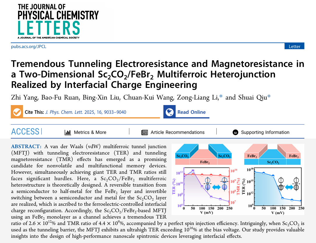 近日,山东师范大学物理与电子科学学院王传奎教授团队在自然指数期刊《The Journal of Physical Chemistry Letters》上发表题为“Tremendous Tunneling Electroresistance and Magnetoresistance in a Two-Dimensional Sc2CO2/FeBr2 Multiferroic Heterojunction Realized by Interfacial Charge Engineering”的学术论文。山东师范大学为唯一论文署名单位,博士研究生羊志为第一作者,李宗良教授和青年教师邱帅为通讯作者。范德华多铁隧道结兼具隧穿电阻 ...
