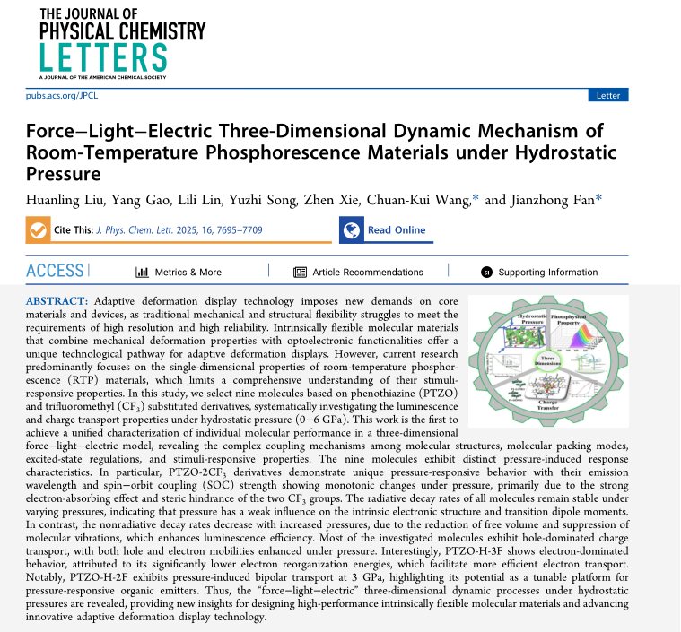近日,山东师范大学物理与电子科学学院王传奎教授团队在自然指数期刊《The Journal of Physical Chemistry Letters》上发表了题为“Force-Light-Electric Three-Dimensional Dynamic Mechanism of Room Temperature Phosphorescence Materials Under Hydrostatic Pressure”的学术论文。山东师范大学为唯一论文署名单位,博士研究生刘幻玲为第一作者,王传奎教授和范建忠副教授为通讯作者。未来自适应形变显示技术对核心材料与器件提出了全新的需求,...
