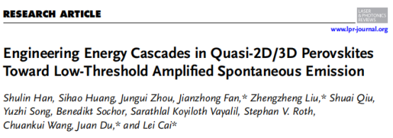 近日, 山东师范大学物理与电子科学学院王传奎教授团队在知名光学期刊《Laser & Photonics Reviews》(JCR 1区 TOP,IF=10)上发表题为“Engineering Energy Cascades in Quasi-2D/3D Perovskites Toward Low-Threshold Amplified Spontaneous Emission”的研究论文。山东师范大学为第一署名单位,我院博士生韩书林与上海光学精密仪器研究所的黄斯豪博士、德国同步辐射中心的周俊贵博士为共同第一作者,山东师范大学的范建忠副教授、...