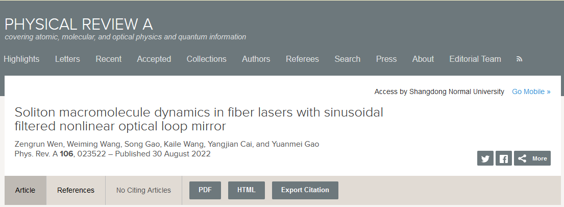 近日,山东师范大学物理与电子科学学院 、 山东师范大学光场调控及应用中心 蔡阳健教授团队在物理学领域国际知名期刊《 Ph ysical Review A 》上发表 题为 “ Soliton macromolecule dynamics in fiber lasers with sinusoidal filtered nonlinear optical loop mirror ” 的 研究论文。 山东师范大学为第一署名单位,第一作者为青年教师温增润博士,通讯作者为高垣梅教授。 Physical Rev...
