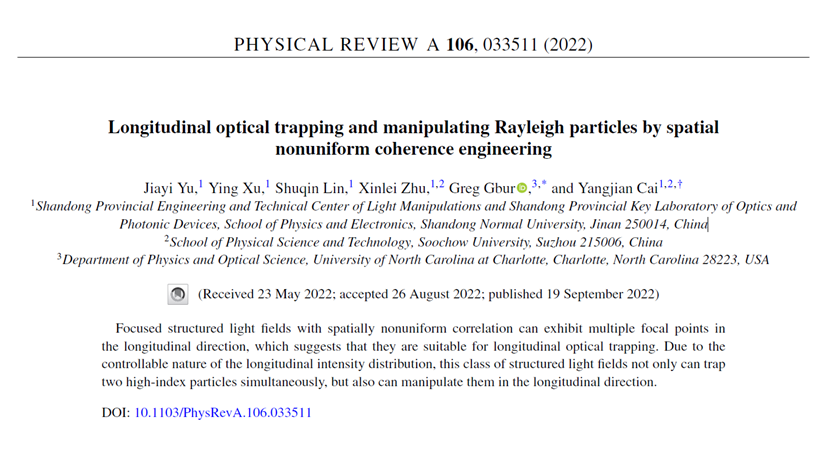 近日,山东师范大学物理与电子科学学院、山东师范大学光场调控及应用中心蔡阳健教授团队与美国北卡罗来纳大学夏洛特分校Greg Gbur教授团队在物理学领域国际知名期刊《Physical Review A》上合作发表题为“Longitudinal optical trapping and manipulating Rayleigh particles by spatial nonuniform coherence engineering”的研究论文。山东师范大学为第一署名单位,第一作者为青年教师余佳益副教授,通讯作者为蔡阳健教授和Gr...