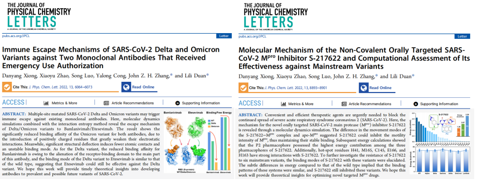 近日,我院段莉莉教授课题组在国际著名期刊《The Journal of Physical Chemistry Letters》上先后发表了题为“Immune Escape Mechanisms of SARS-CoV-2 Delta and Omicron Variants against Two Monoclonal Antibodies That Received Emergency Use Authorization”和“Molecular Mechanism of the Non-Covalent Orally Targeted SARS-CoV-2 Mpro Inhibitor S-217622 and Computational Assessment of Its Effectiveness agains...