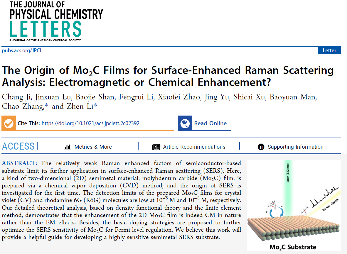 近日,山东师范大学物理与电子科学学院满宝元教授课题组在国际著名期刊《The Journal of Physical Chemistry Letters》上发表了题为“The Origin of Mo2C Films for Surface-Enhanced Raman Scattering Analysis: Electromagnetic or Chemical Enhancement?”的研究论文。山东师范大学为第一署名单位,第一作者为博士生纪昌,通讯作者为张超教授、李振博士。 图1. 文章作者及摘要截图二维过渡金属碳化物(2D TMCs)由于其优异的物...