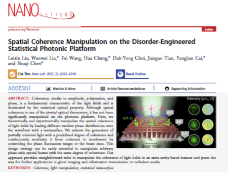 近日,山东师范大学物理与电子科学学院、山东师范大学光场调控及应用中心蔡阳健教授团队在国际顶级期刊《Nano Letters》上发表题为“Spatial Coherence Manipulation on the Disorder-Engineered Statistical Photonic Platform”的研究论文。山东师范大学为第一署名单位,第一作者为青年教师刘磊鑫博士,通讯作者为蔡阳健教授以及南开大学陈树琪教授、程化教授和刘文玮副教授。部分相干光场在鬼成像、湍流传输等领域中发挥...