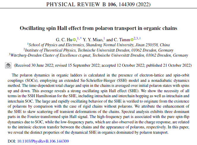 近日,胡贵超教授团队与德国德累斯顿工业大学理论物理研究所Carsten Timm教授合作,在物理领域国际著名期刊《Physical Review B》上发表了题为“Oscillating spin Hall effect from polaron transport in organic chains”的学术论文。山东师范大学为论文第一署名单位,胡贵超教授为第一作者,通讯作者为胡贵超教授和Carsten Timm教授。 自旋霍尔效应基于材料自身的自旋-轨道耦合作用,实现电流和自旋流的相互转换,是凝聚态物...