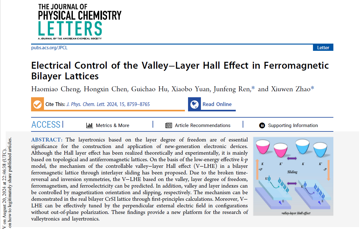 近日,山东师范大学物理与电子科学学院任俊峰教授团队在国际知名期刊《The Journal of Physical Chemistry Letters》上发表了题为“Electrical Control of the Valley-Layer Hall Effect in Ferromagnetic Bilayer Lattices”的学术论文。山东师范大学为唯一论文署名单位,硕士研究生程昊淼为第一作者,任俊峰教授和赵秀雯博士为通讯作者。基于层和谷自由度的层电子学和谷电子学对新一代电子设备的制造和应用具有重要意义。虽然层霍尔效应已在理论和实验上实现,...