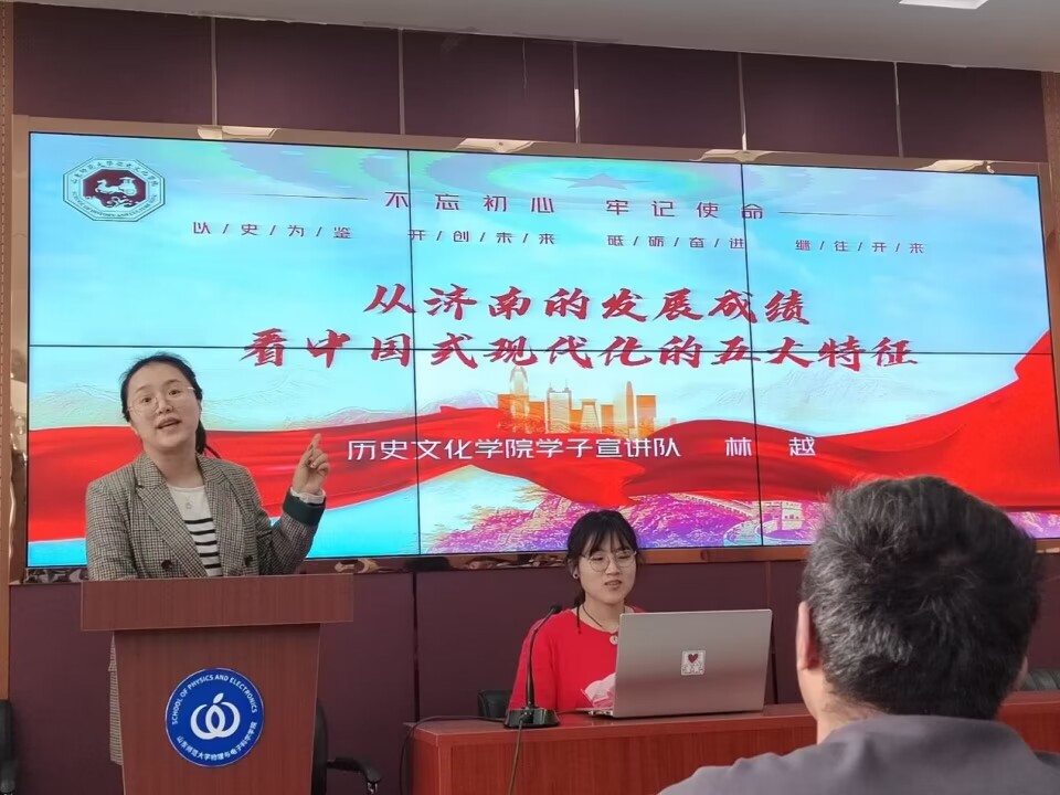 4月11日中午,物理与电子科学学院于文澜楼A区F347室开展“从济南的发展成绩看中国式现代化的五大特征”主题讲座,本次讲座由历史文化学院学子宣讲队队员林越担任主讲人,学院团委书记方芳,21级、22级班团干部百余人参加此次讲座。林越以“中国式现代化的生成逻辑”为基础,从“人口规模巨大”、“全体人民共同富裕”、“物质文明和精神文明相协调”、“人与自然和谐共生”、“和平发展道路”五个特征方面展开阐述。她结合“全面建设小康社会”...