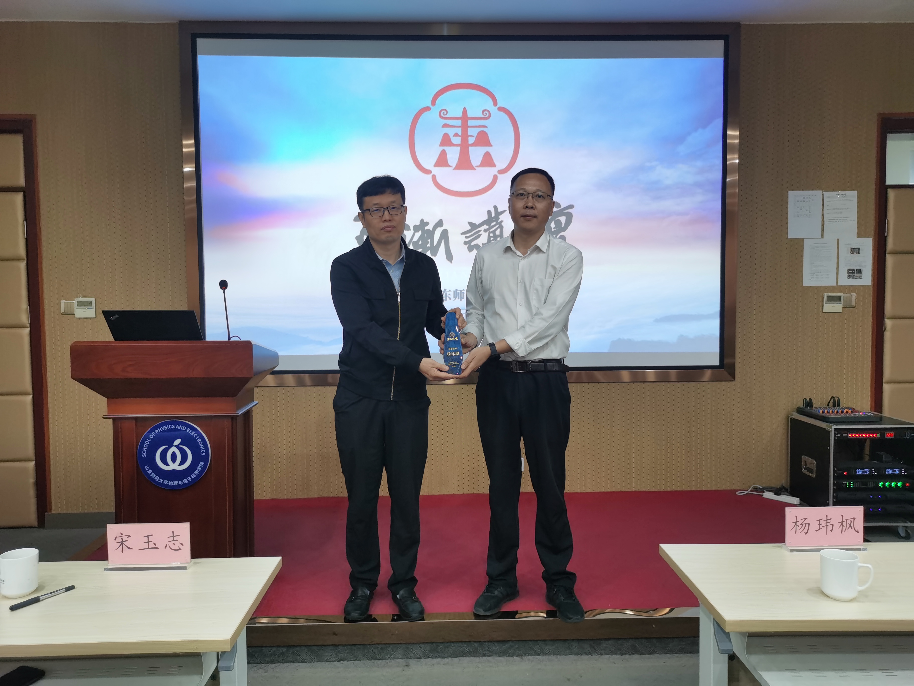 6月6日下午,物理与电子科学学院于树惠堂报告厅举办“物电好榜样”颁奖暨社会奖助学金颁发仪式。副校长、物电学院院长蔡阳健出席,山东博视雅建设工程有限公司董事长陈实、大恒光电山东区大区经理王浩然、山东办事处总经理孙建强、山东万腾数字科技有限公司教育总监孔梦清、山东师润文化科技有限公司总经理孙尉彭受邀参加。研究生院、国际交流处、合作发展处、人力资源处负责同志,学院班子成员,师生代表200余人参加活动。蔡阳健与各位企业代表嘉宾上台,...